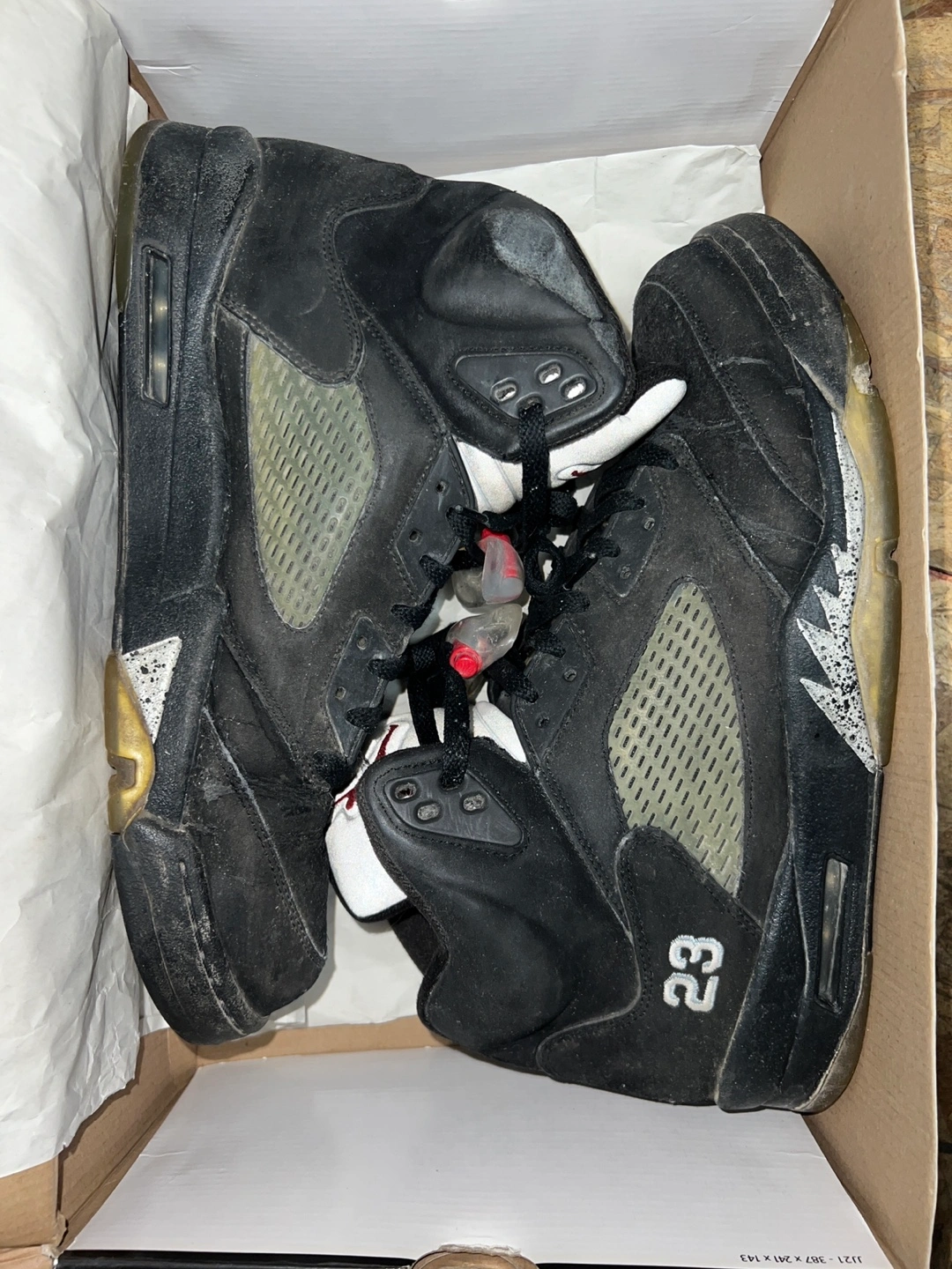 5Pre-owned Air Jordan 5 Retro sneakers. Black leather upper. Metallic silver accents. Size not specified. Some wear and tear visible.