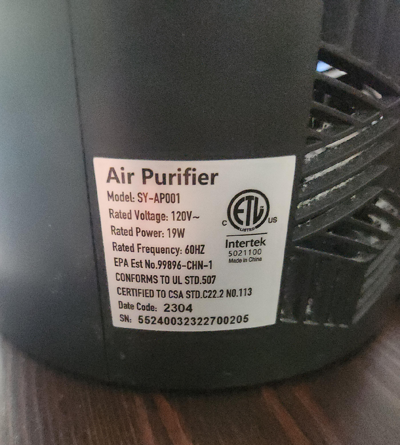 Selling an air purifier. It has a timer, light, sleep mode, and speed settings. The model number is SY-AP001. The date code is 2304. Currently has no filter in it.