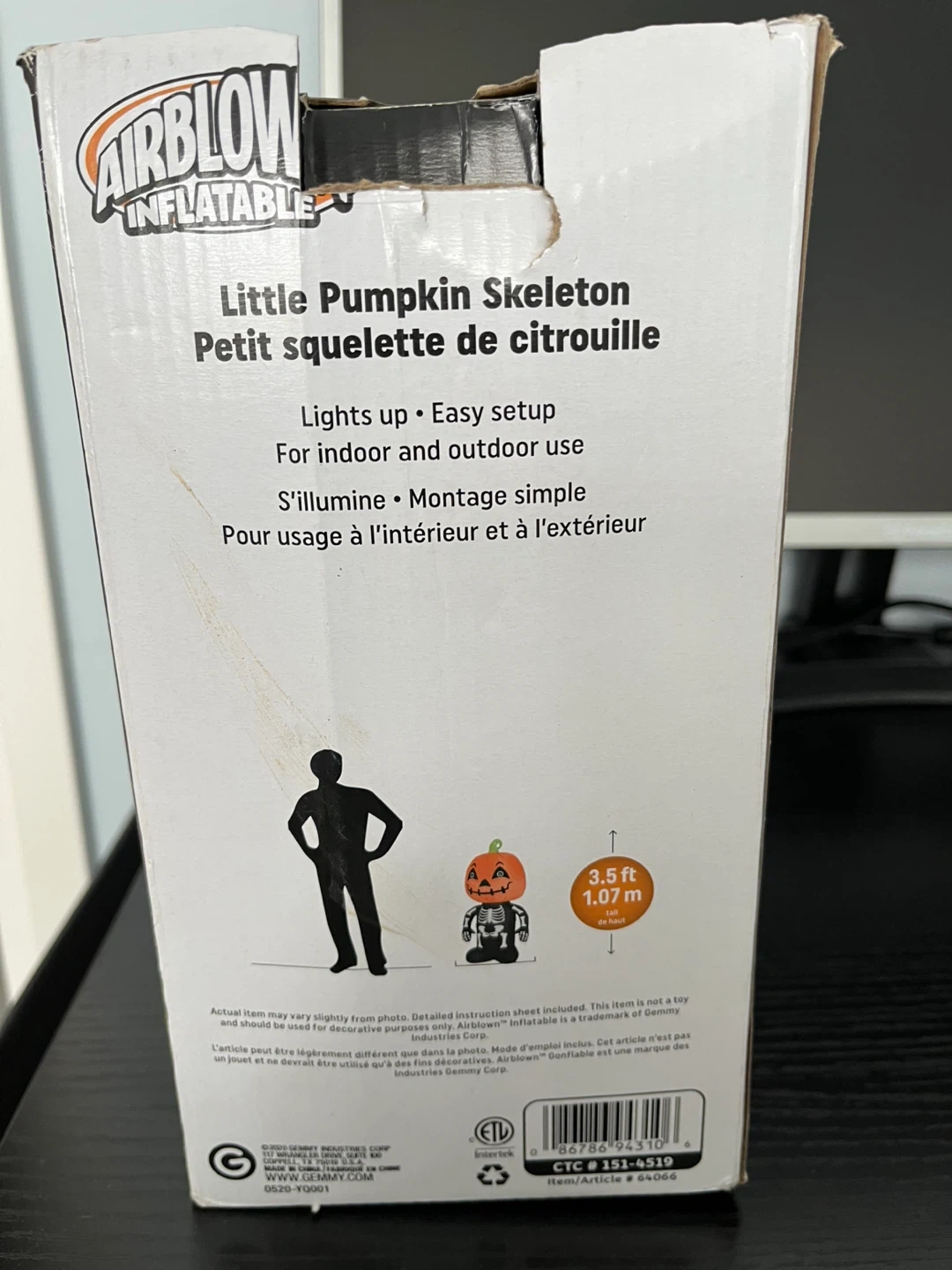 75Selling an Airblown Inflatable Little Pumpkin Skeleton, standing 3.5 ft (1.07 m) tall! It lights up and is easy to set up. Perfect for indoor and outdoor use to add a bit of Halloween fun!