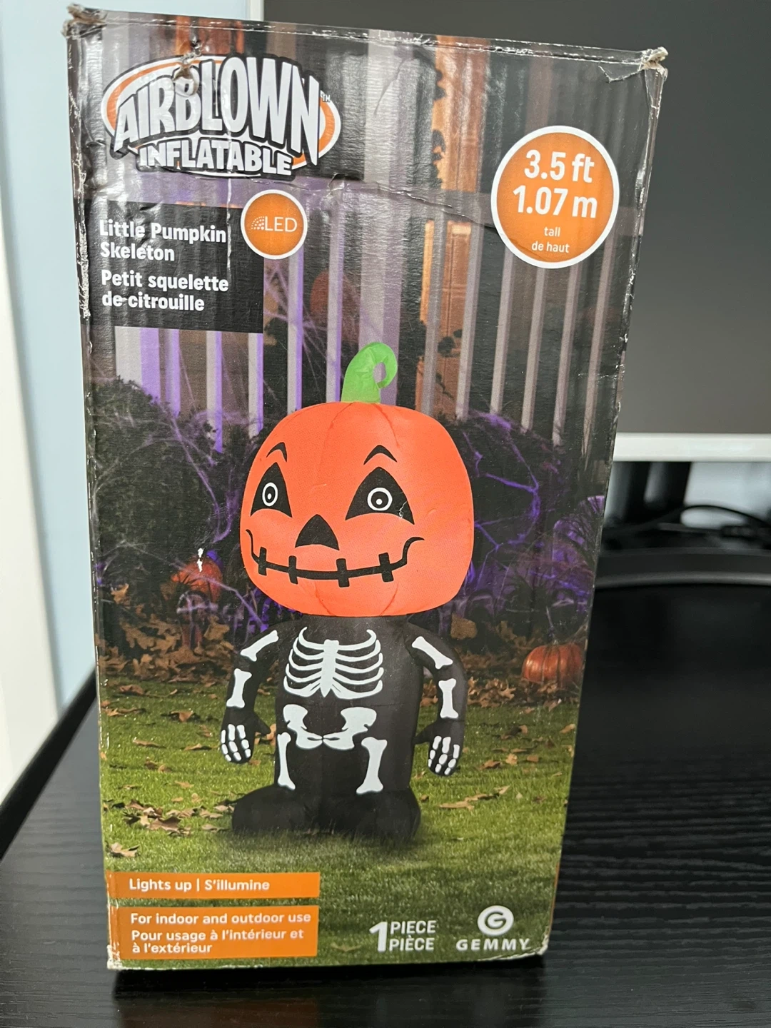 65Selling an Airblown Inflatable Little Pumpkin Skeleton, standing 3.5 ft (1.07 m) tall! It lights up and is easy to set up. Perfect for indoor and outdoor use to add a bit of Halloween fun!