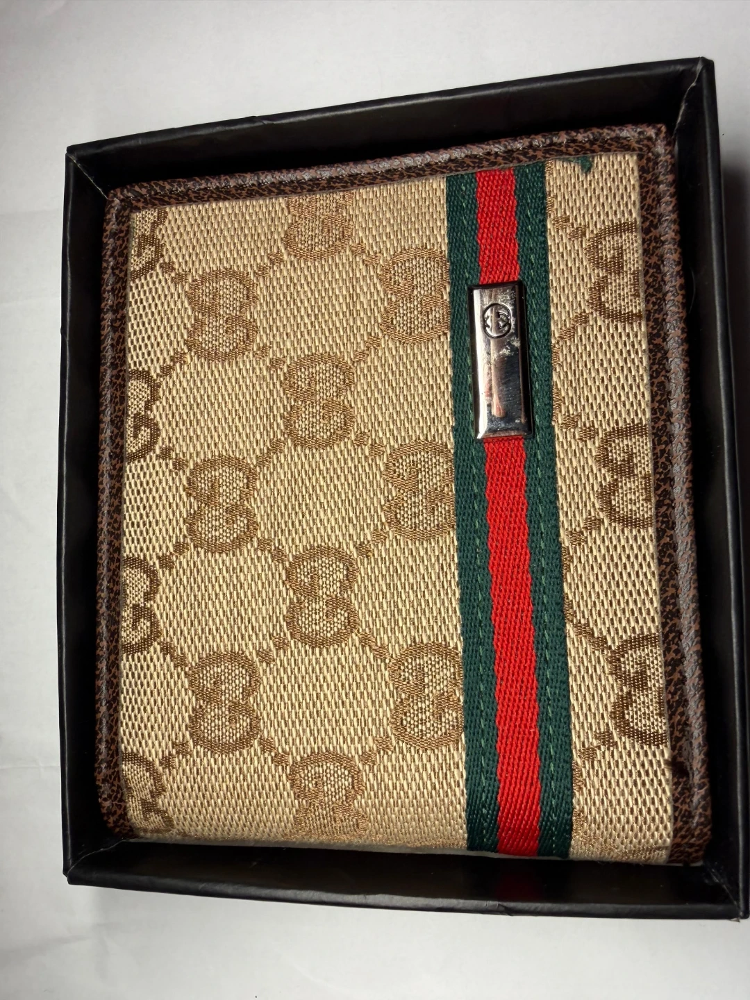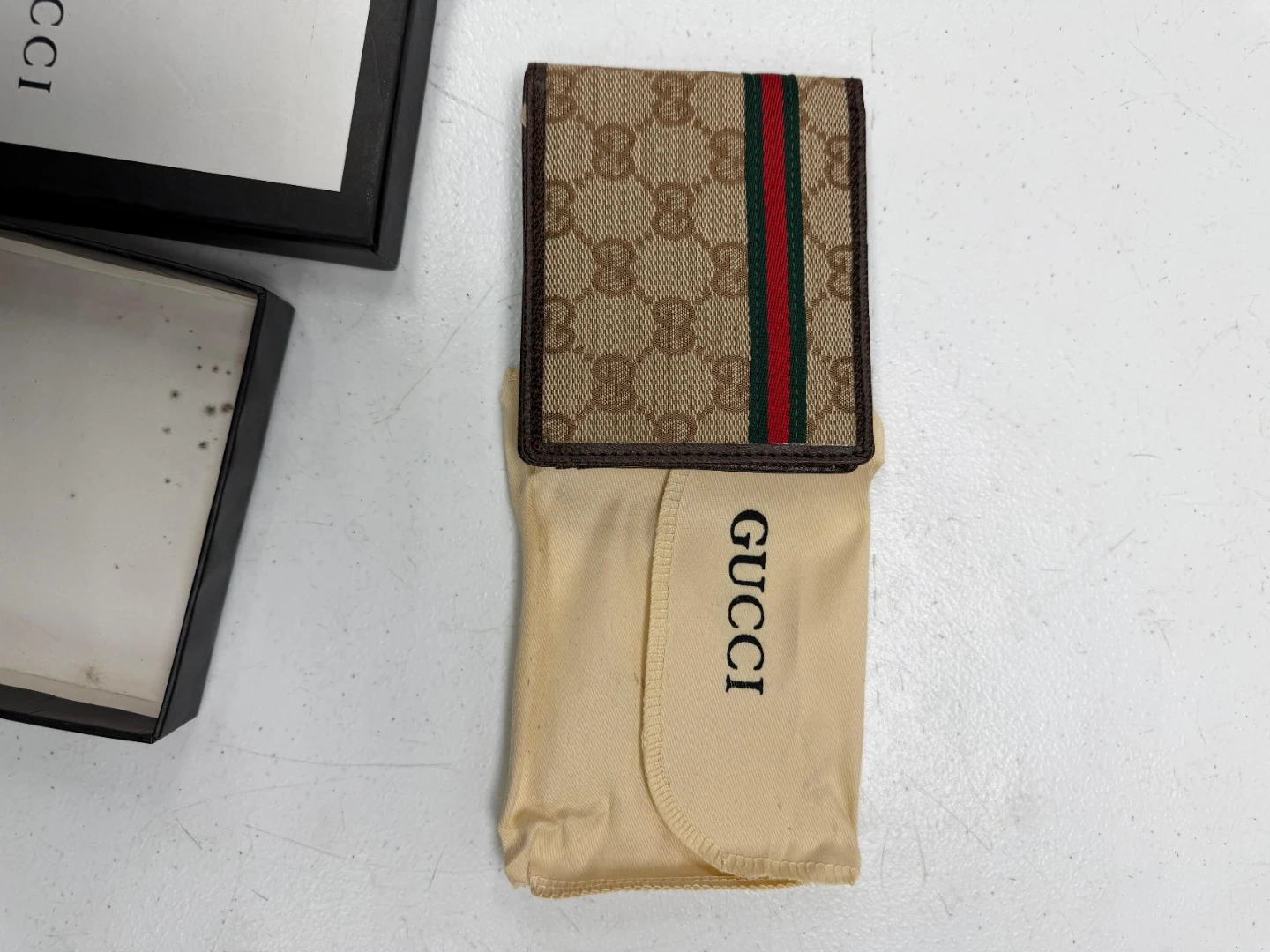 Gucci bi-fold wallet in signature monogram canvas. Features the classic red and green stripe detail. Includes original box and dust bag.