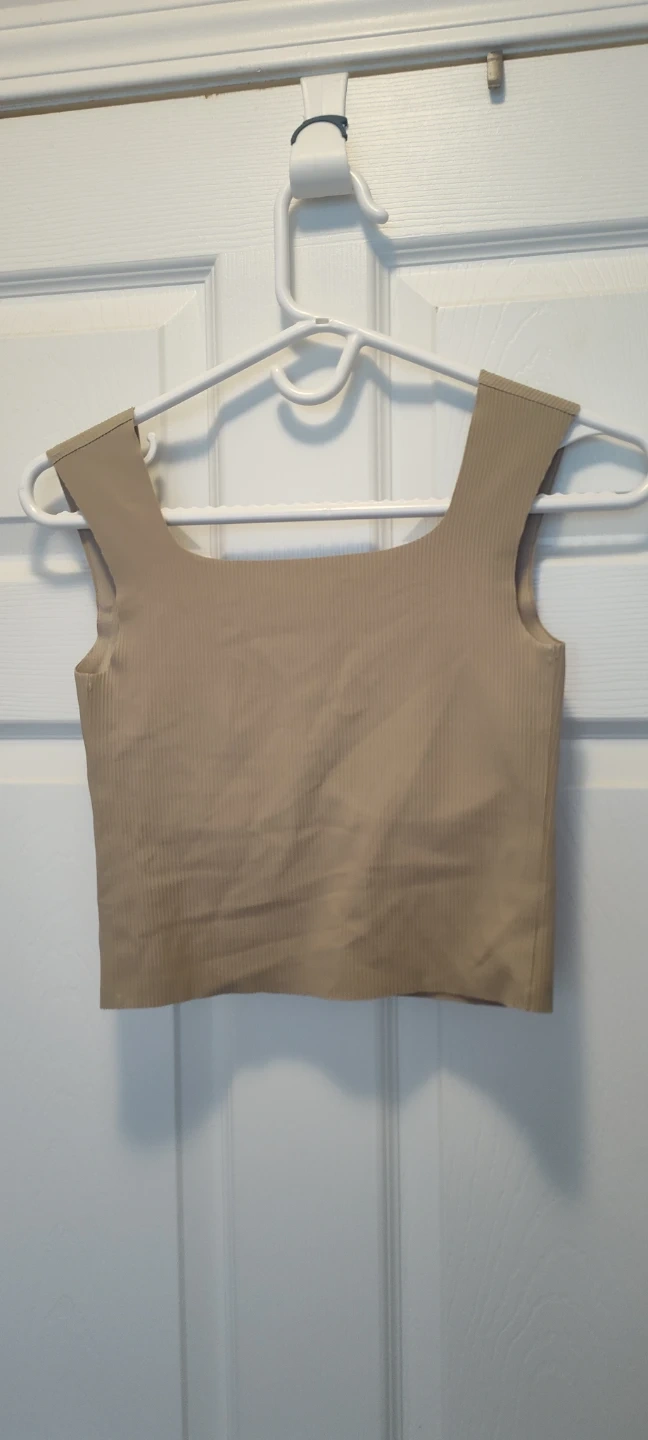 Comfortable ribbed crop top with a square neckline. It's made from a soft, stretchy fabric. This top is sleeveless with built-in cups and hits at the waist. It's great for layering or wearing on its own!