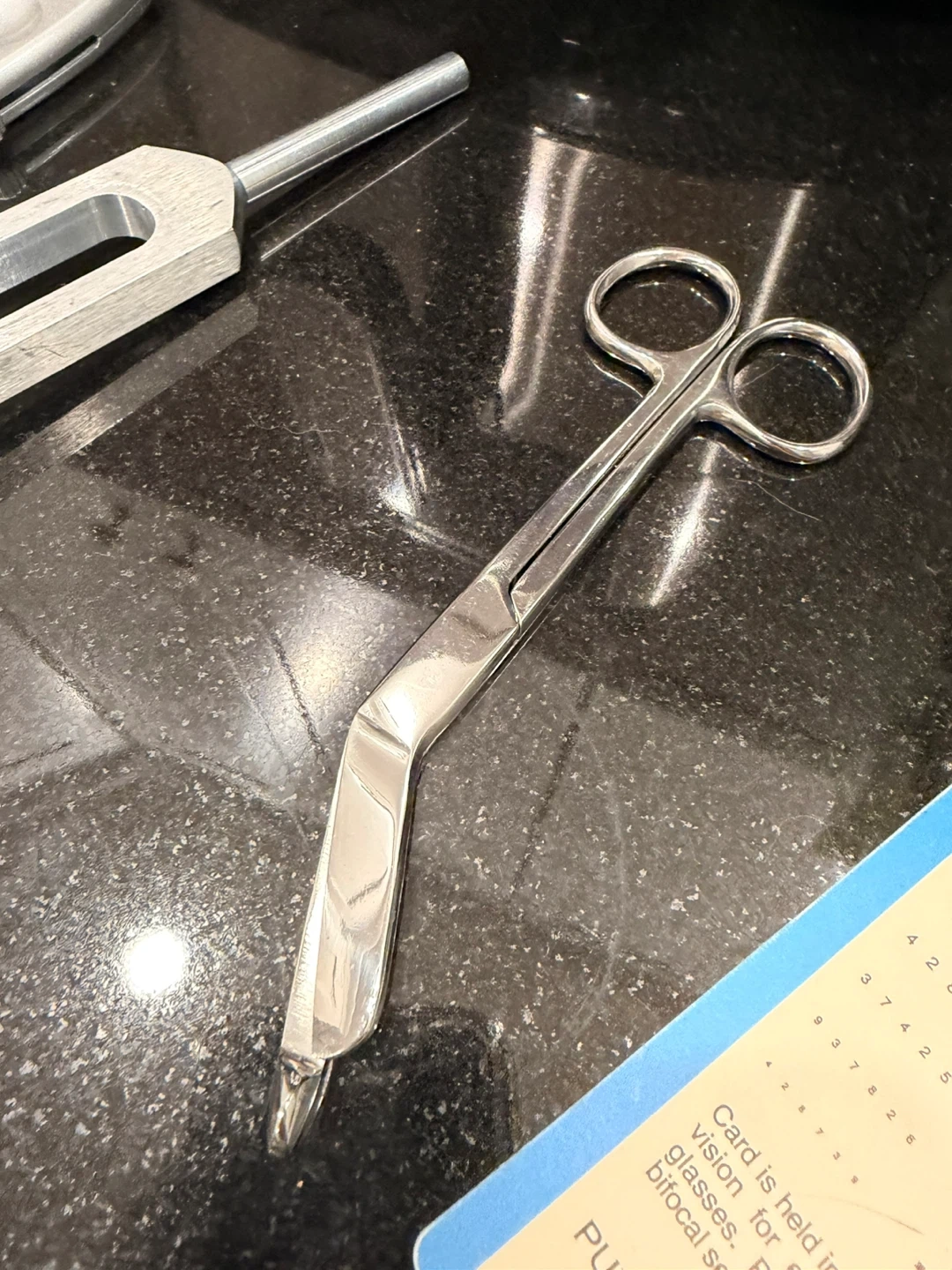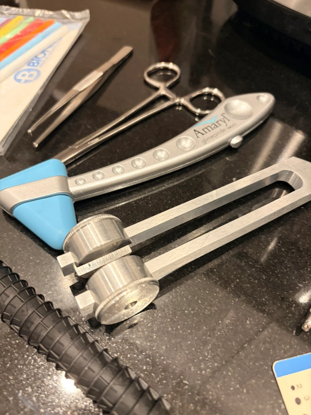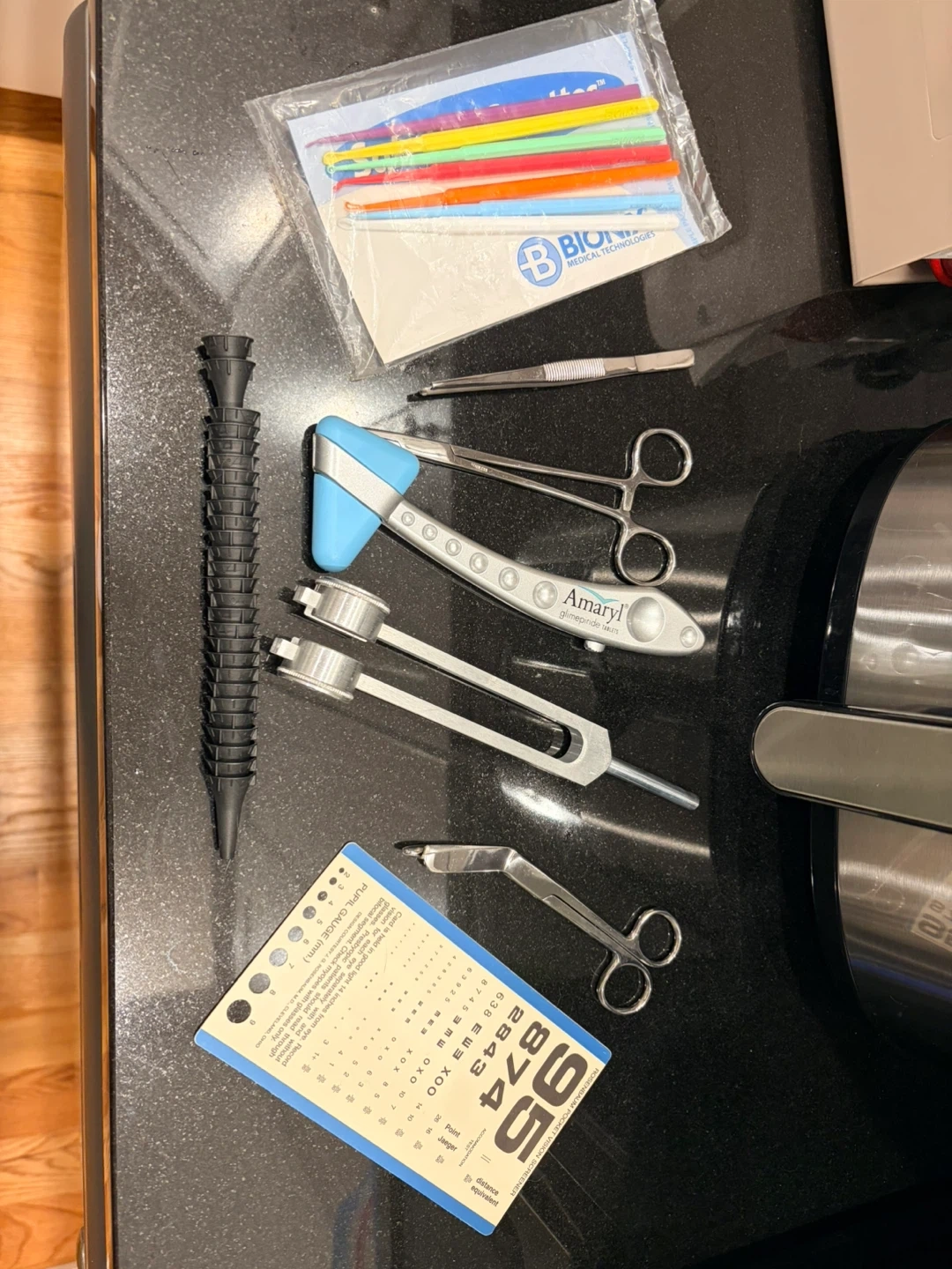 This set includes medical instruments, a reflex hammer, and sterile applicators. It features metal forceps, scissors, and other tools. The set comes with a set of colorful applicators and a tuning fork.