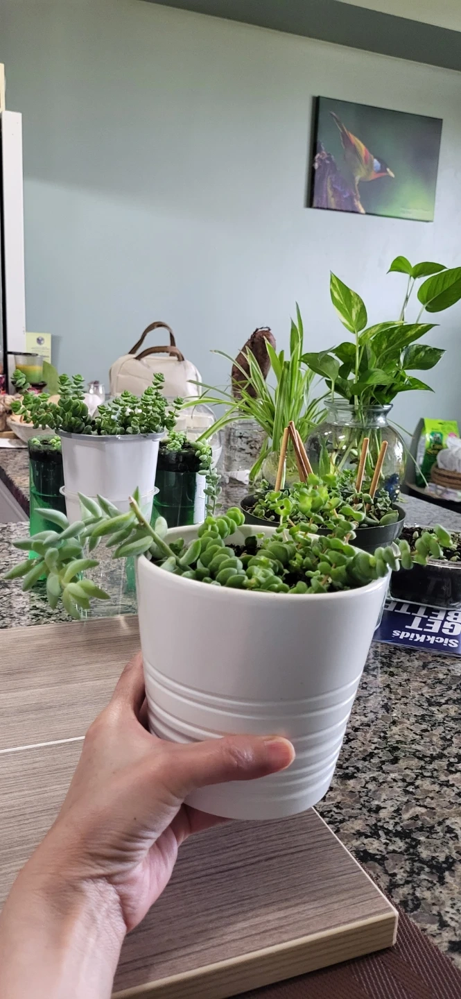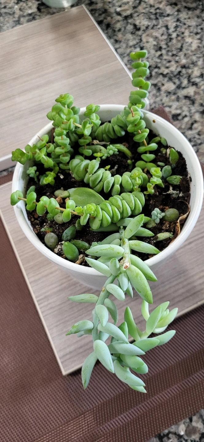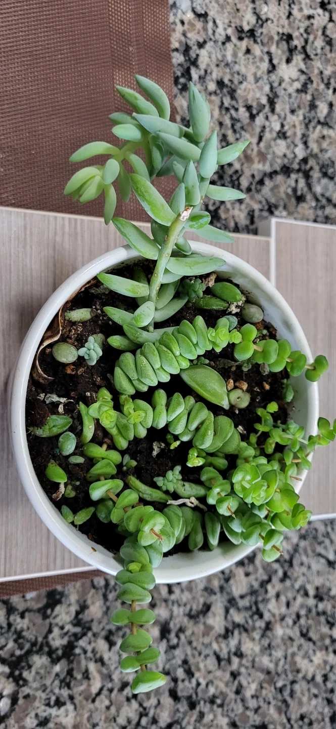 Multiple succulents in a white Ikea ceramic pot.