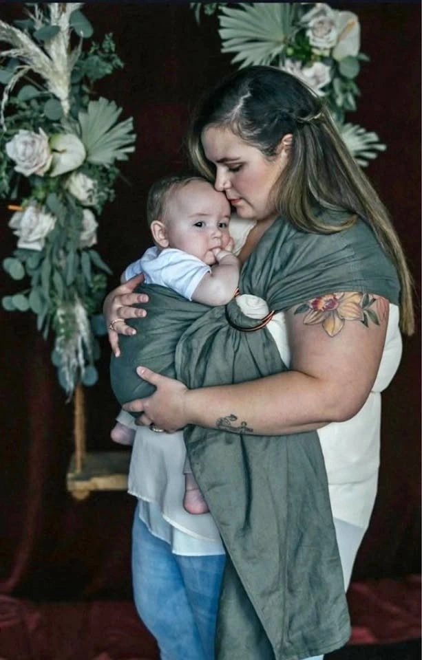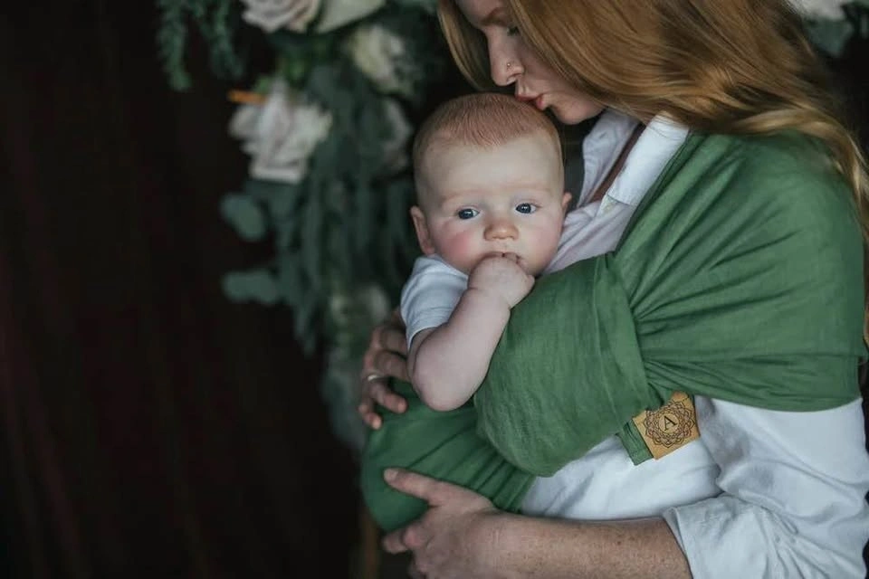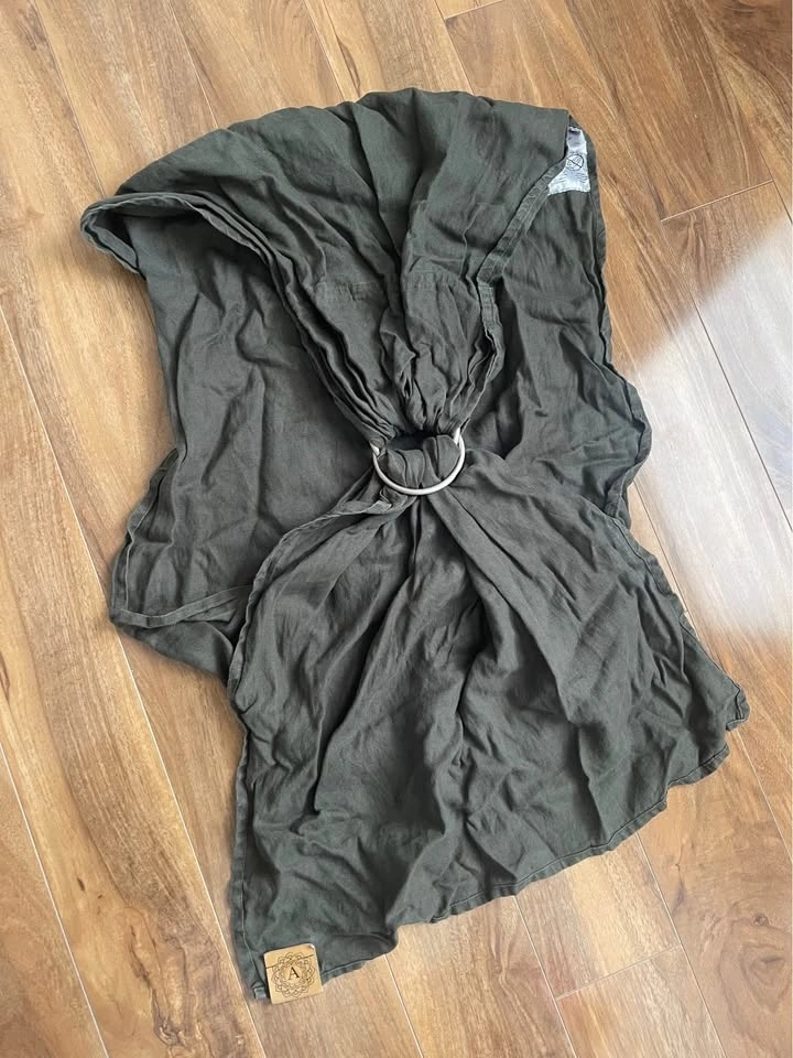 Aura Ring Sling in dark green. Made from 100% linen, a natural, antimicrobial fiber. Good used condition, just a bit wrinkly from being packed. Made by a small company in Alberta, Canada. Originally over $200.