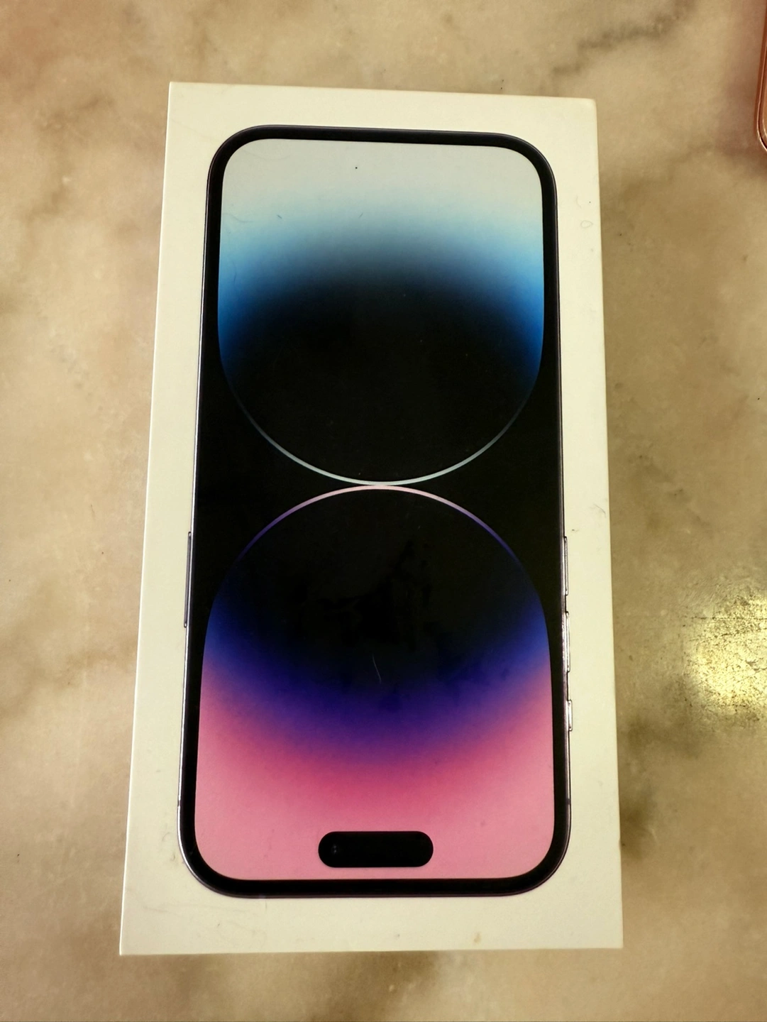 Pre-owned iPhone 14 Pro. Deep purple colour. Minor cosmetic wear, but otherwise it’s pretty pristine. Includes original box and charger. The battery is 91%. I can also throw in a Taylor Swift case if you’d like.