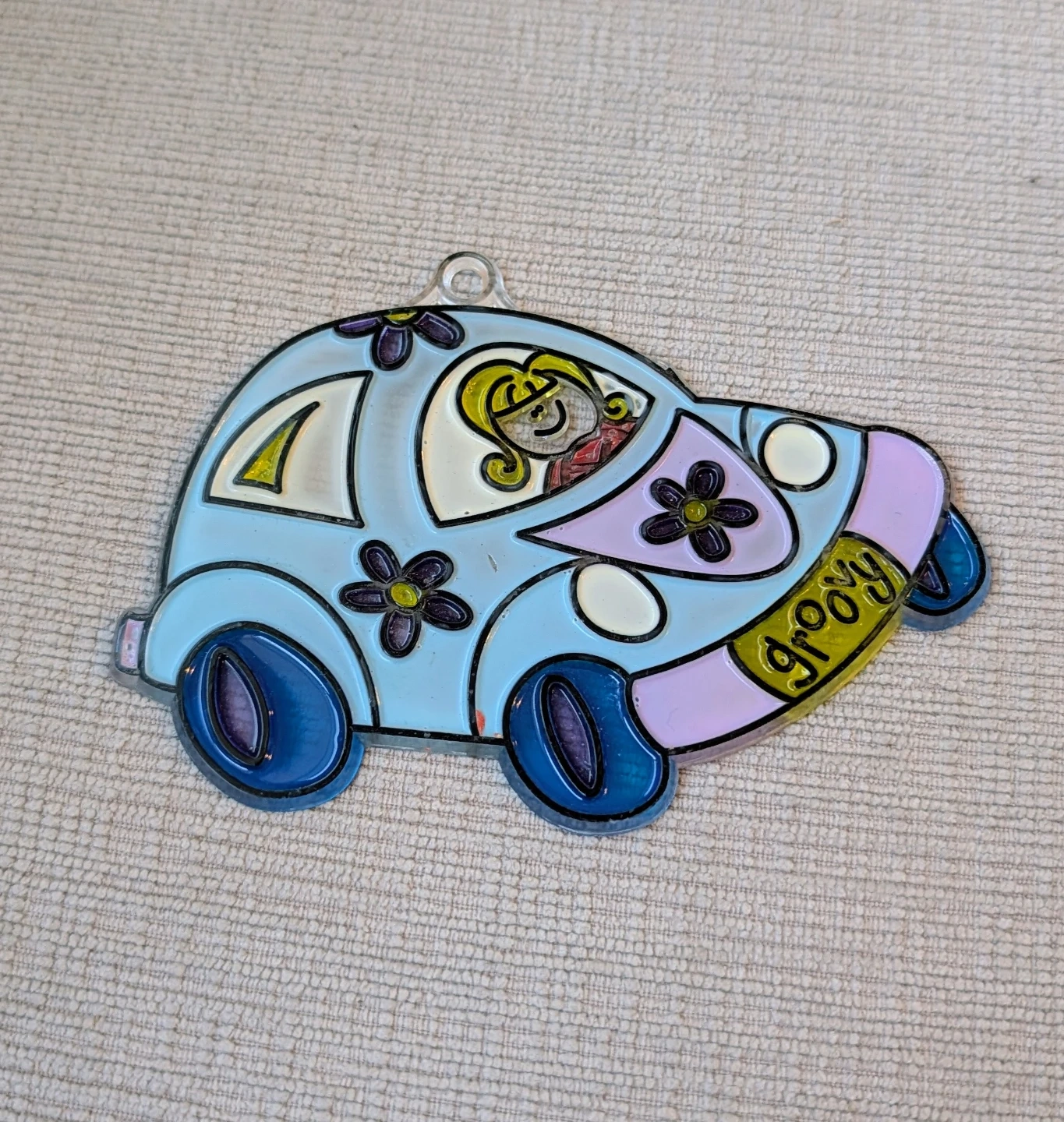 This is a colourful hanging ornament shaped like a retro car. It's light blue with purple flowers and the word 'groovy' on the licence plate. It has a loop at the top for hanging. It's a fun decoration!