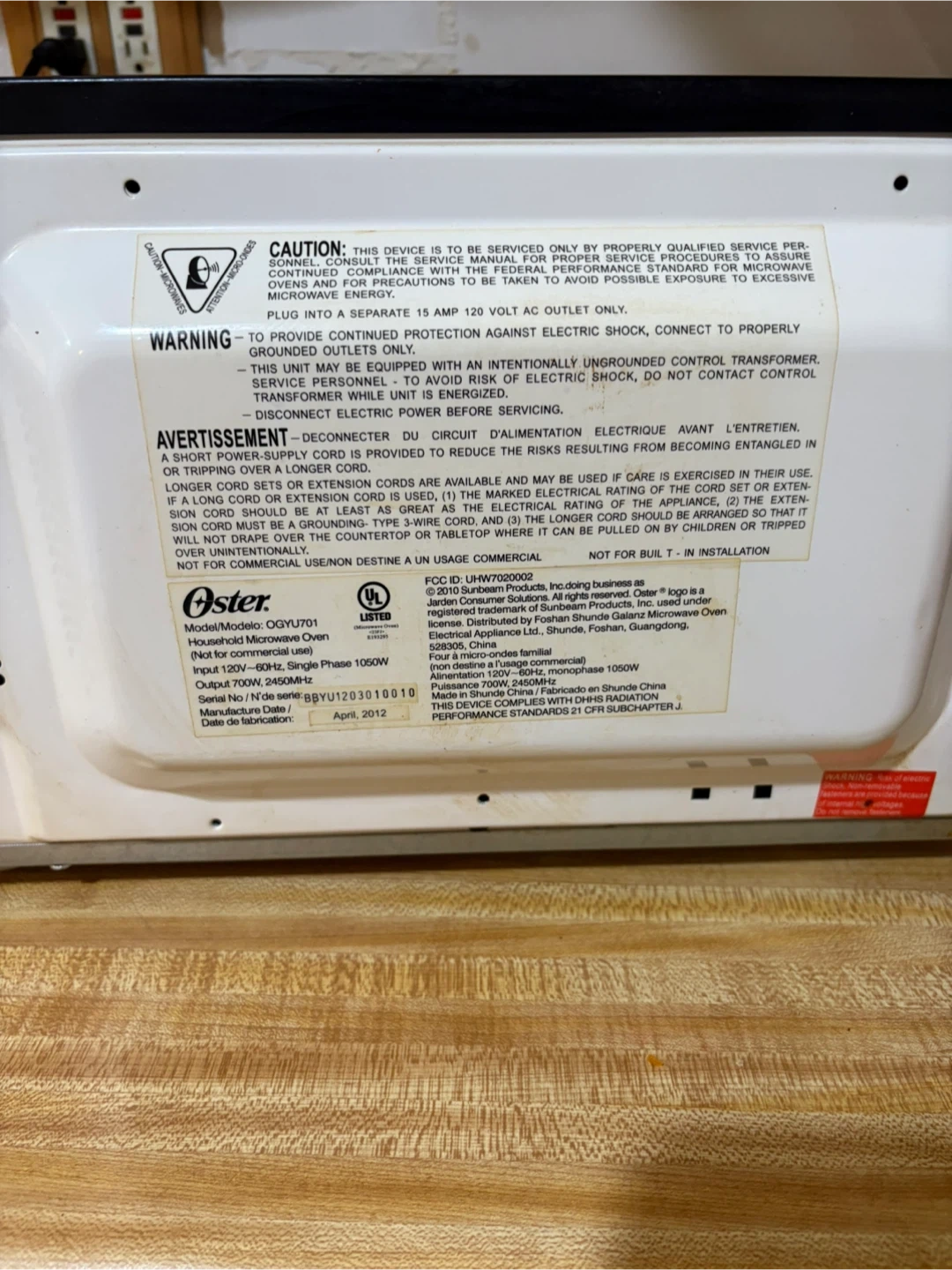 Selling an Oster microwave oven, model OGYU701. This is a household microwave oven. It requires 120V AC outlet only. The manufacturing date is April 2012