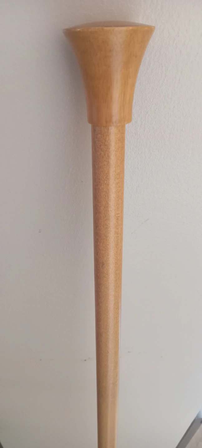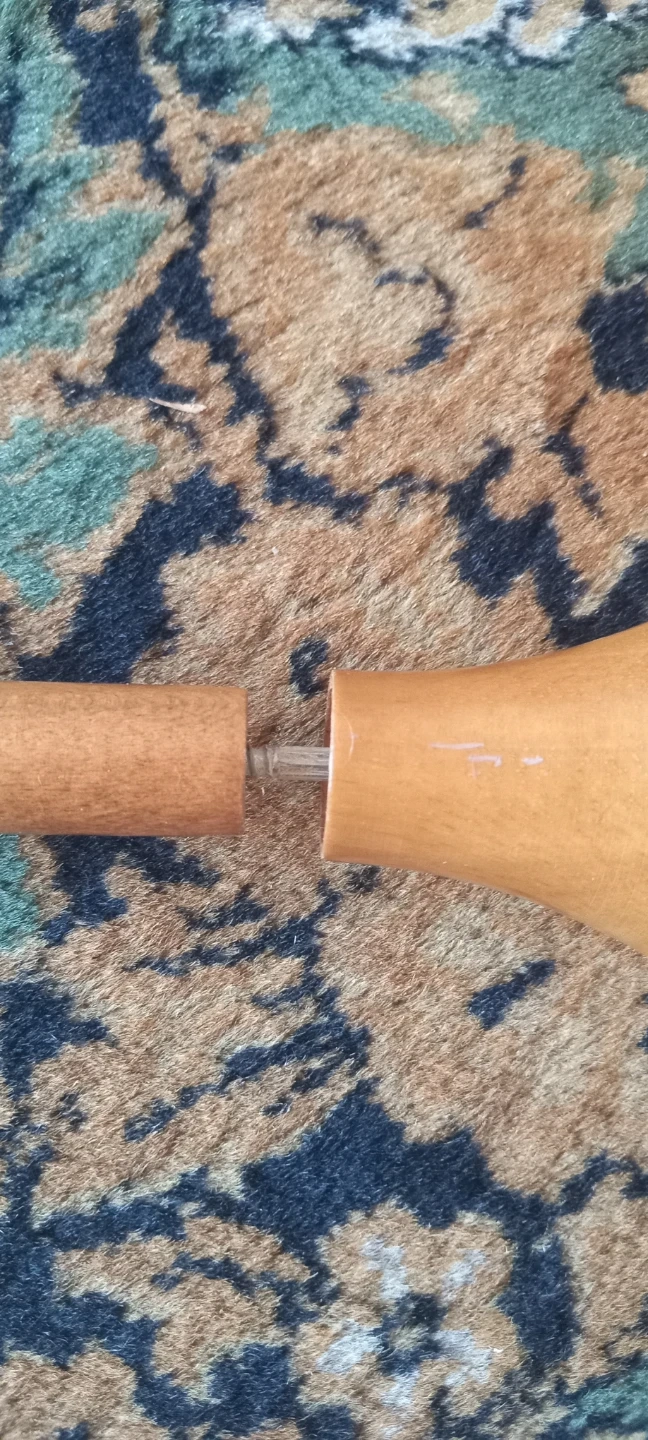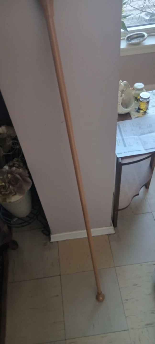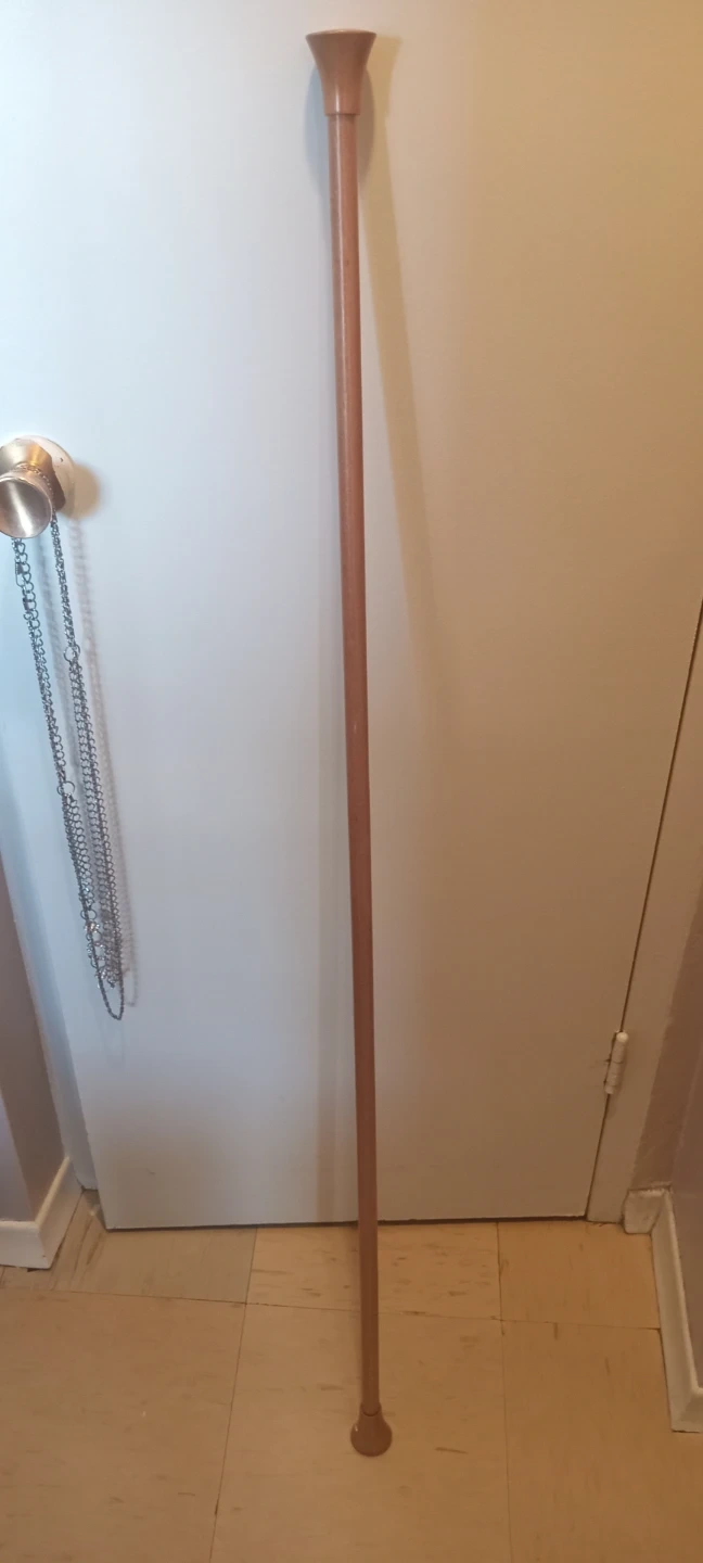 A wooden curtain rod that can adjust. The ends unscrew to width of window