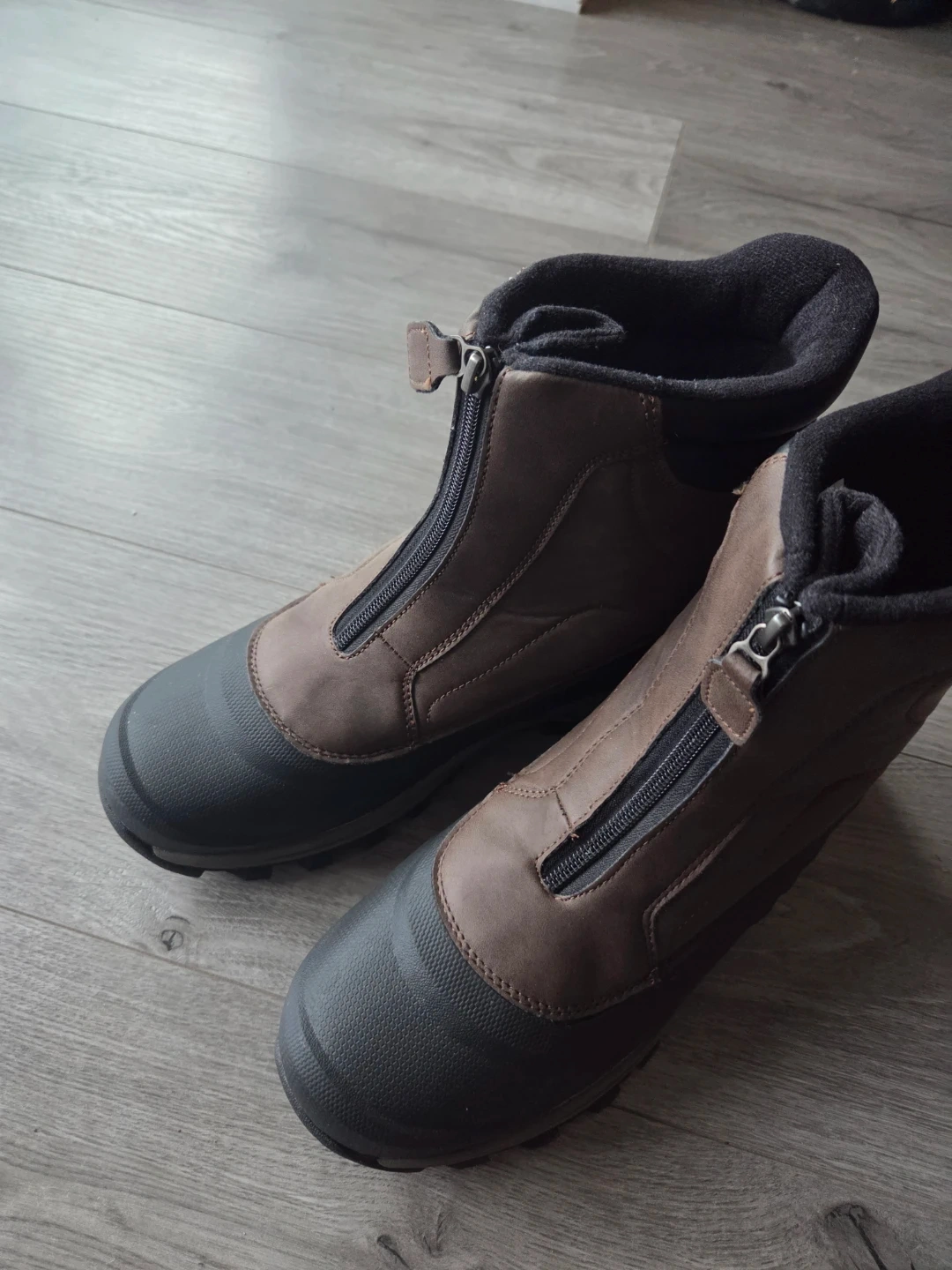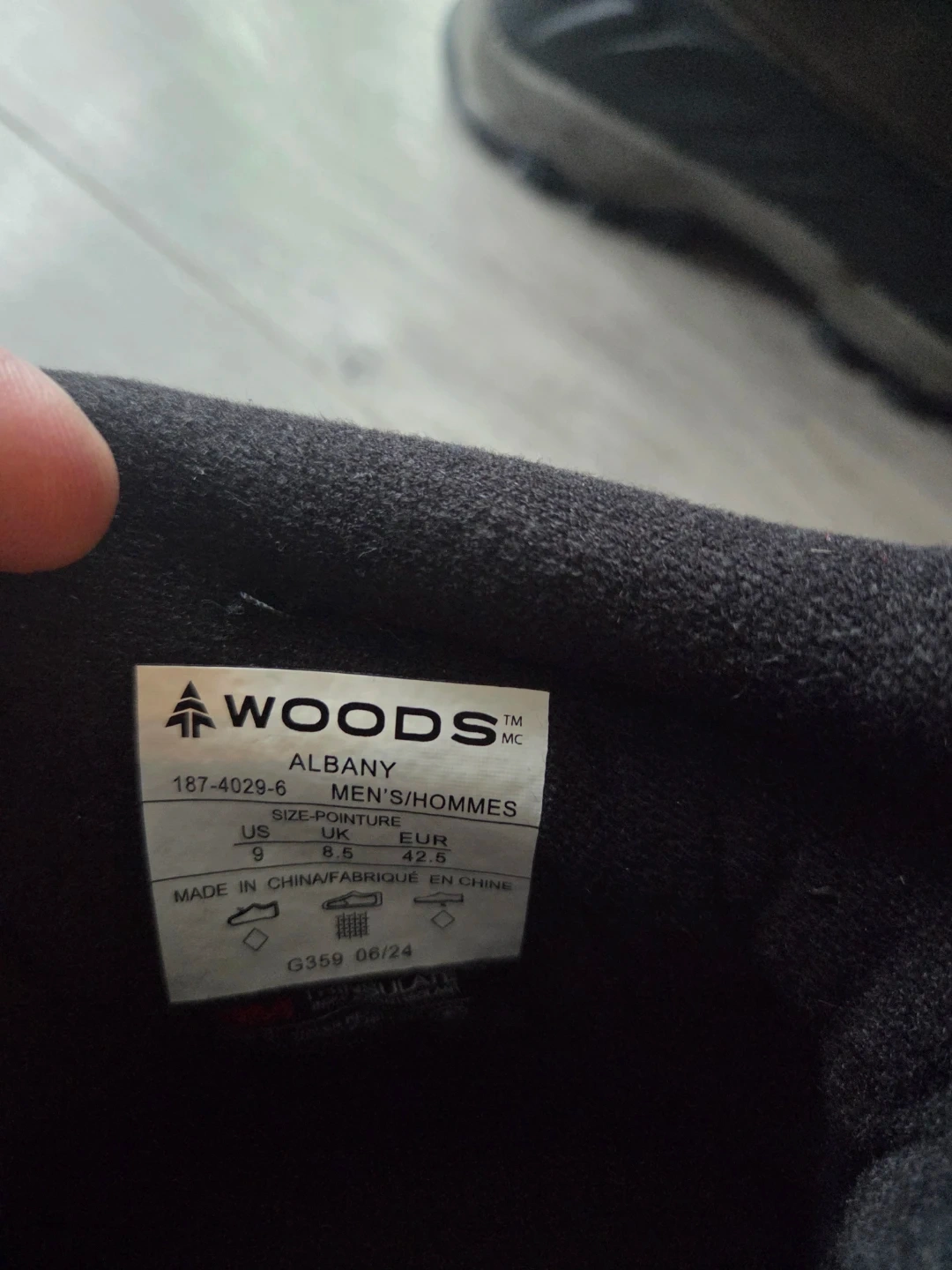Woods Albany men's winter boots. Waterproof design for cold weather. Front zipper closure. Men's US size 9, UK 8.5, EUR 42.5.