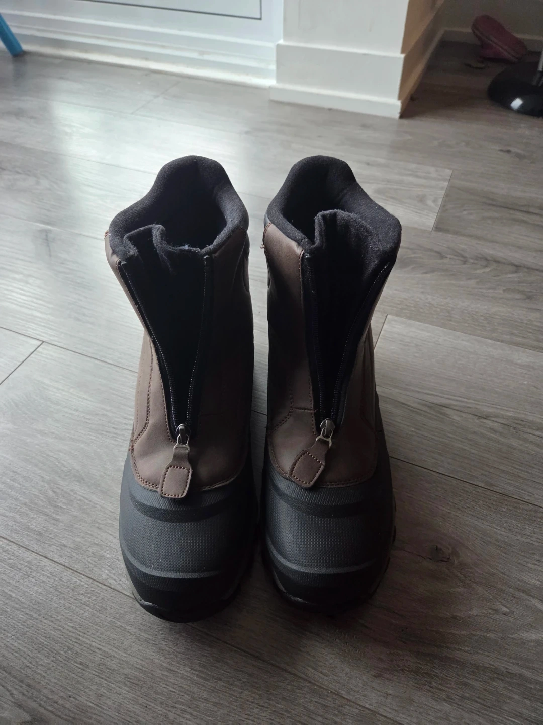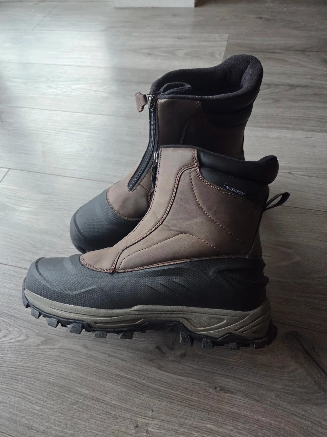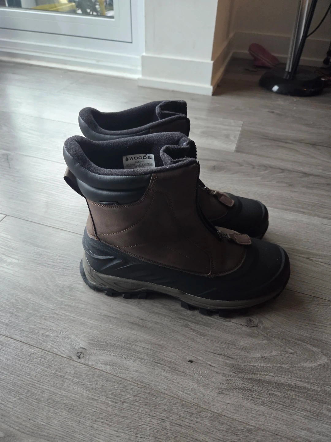 Woods Albany men's winter boots. Waterproof design for cold weather. Front zipper closure. Men's US size 9, UK 8.5, EUR 42.5.
