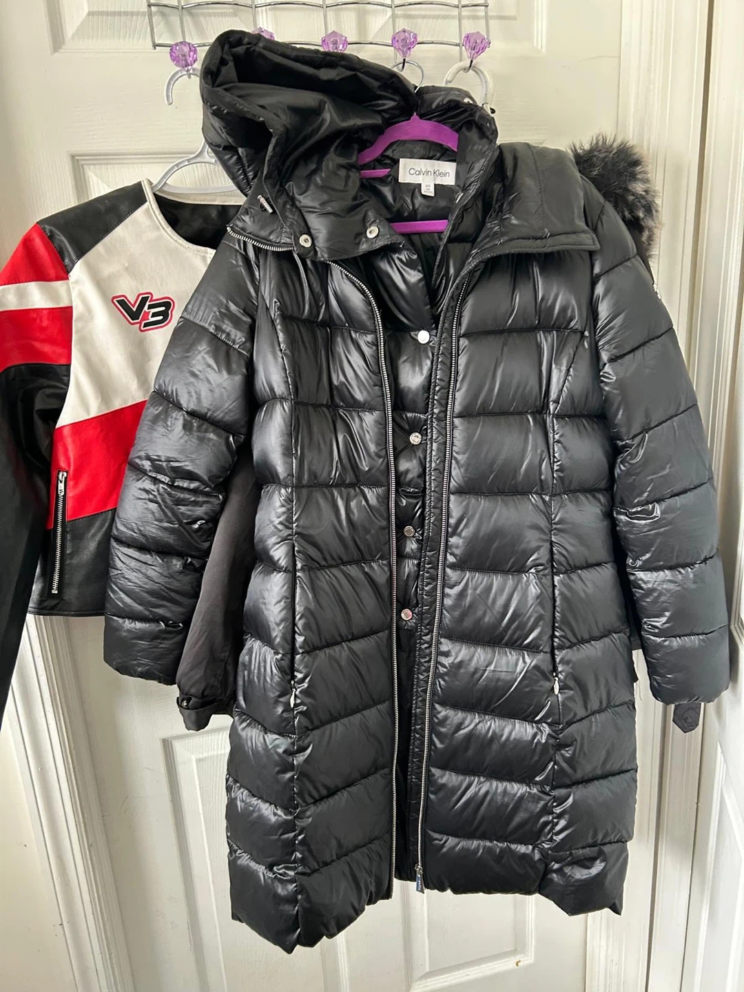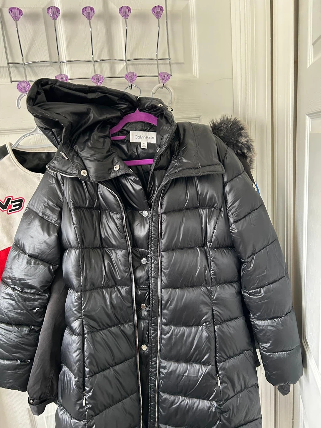 This Calvin Klein black puffer coat features a hood and a shiny finish. It's designed for warmth with a quilted pattern. It's a stylish outerwear option.
