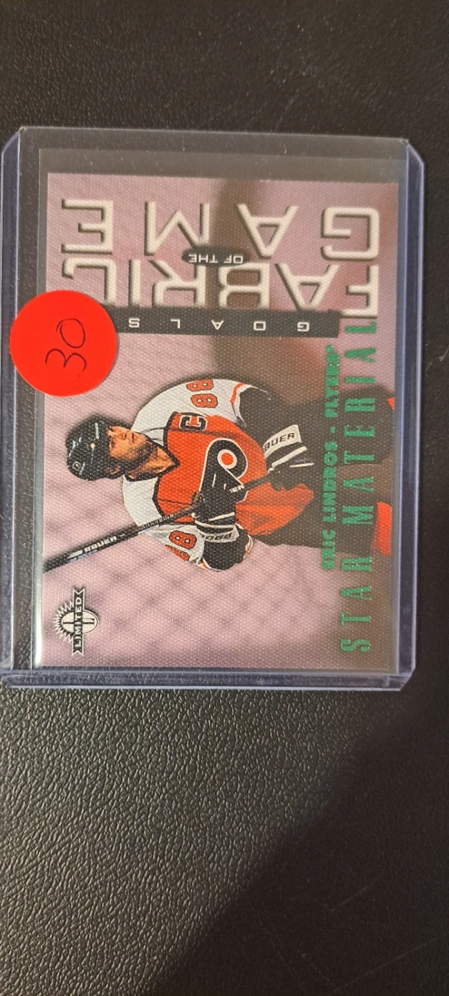 This is a 1996-97 Upper Deck Star Materials hockey card featuring Eric Lindros. It's part of the Goals of the Game series. This card is limited.