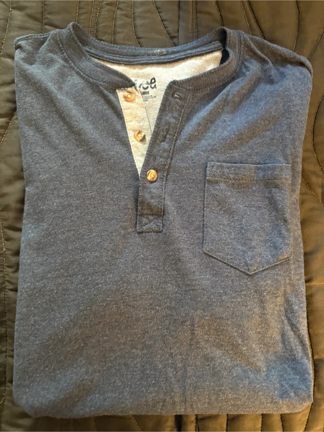 Selling a Lee men's henley shirt in size large. It's a comfy, casual shirt with a classic look. Perfect for everyday wear!