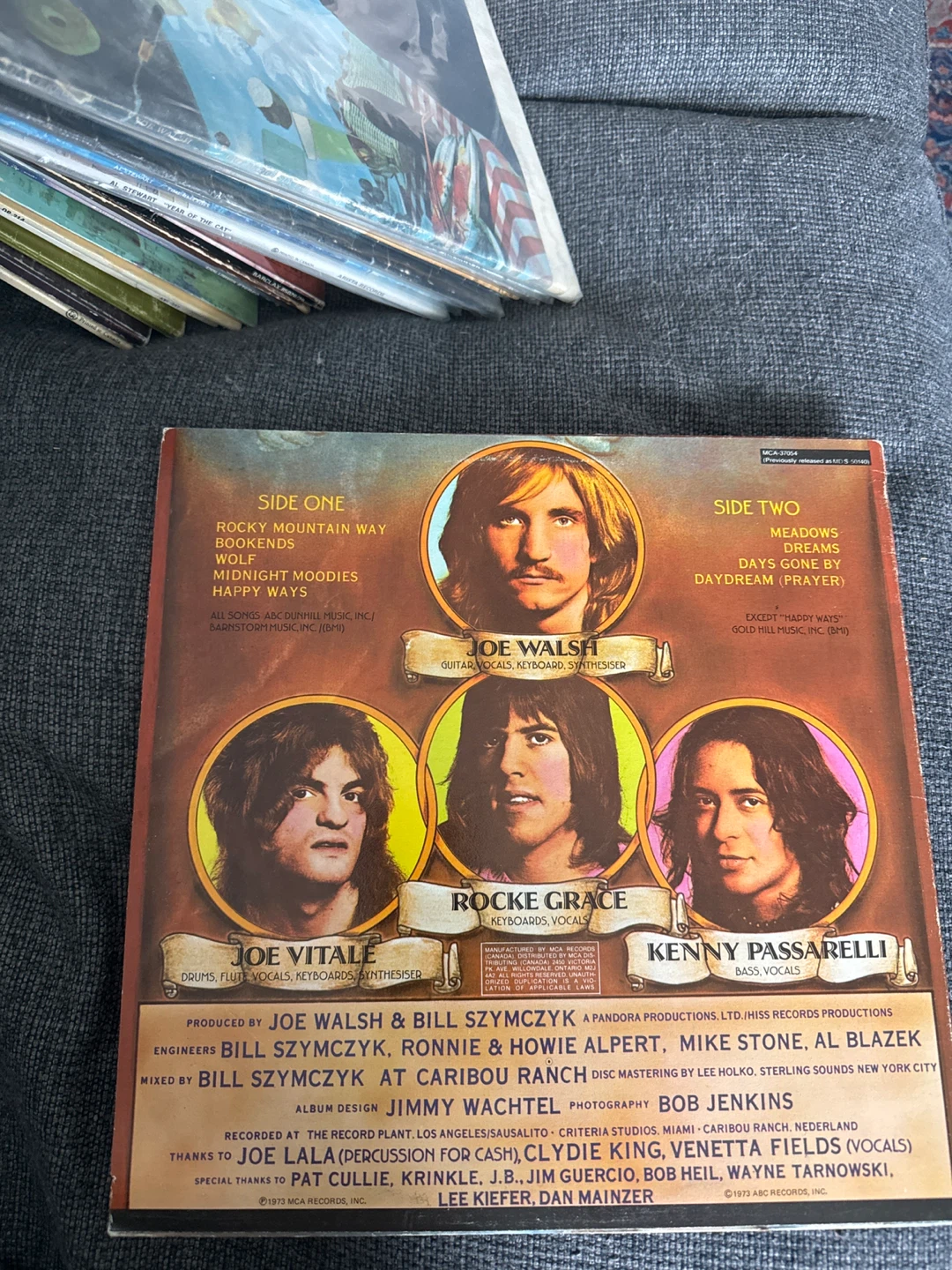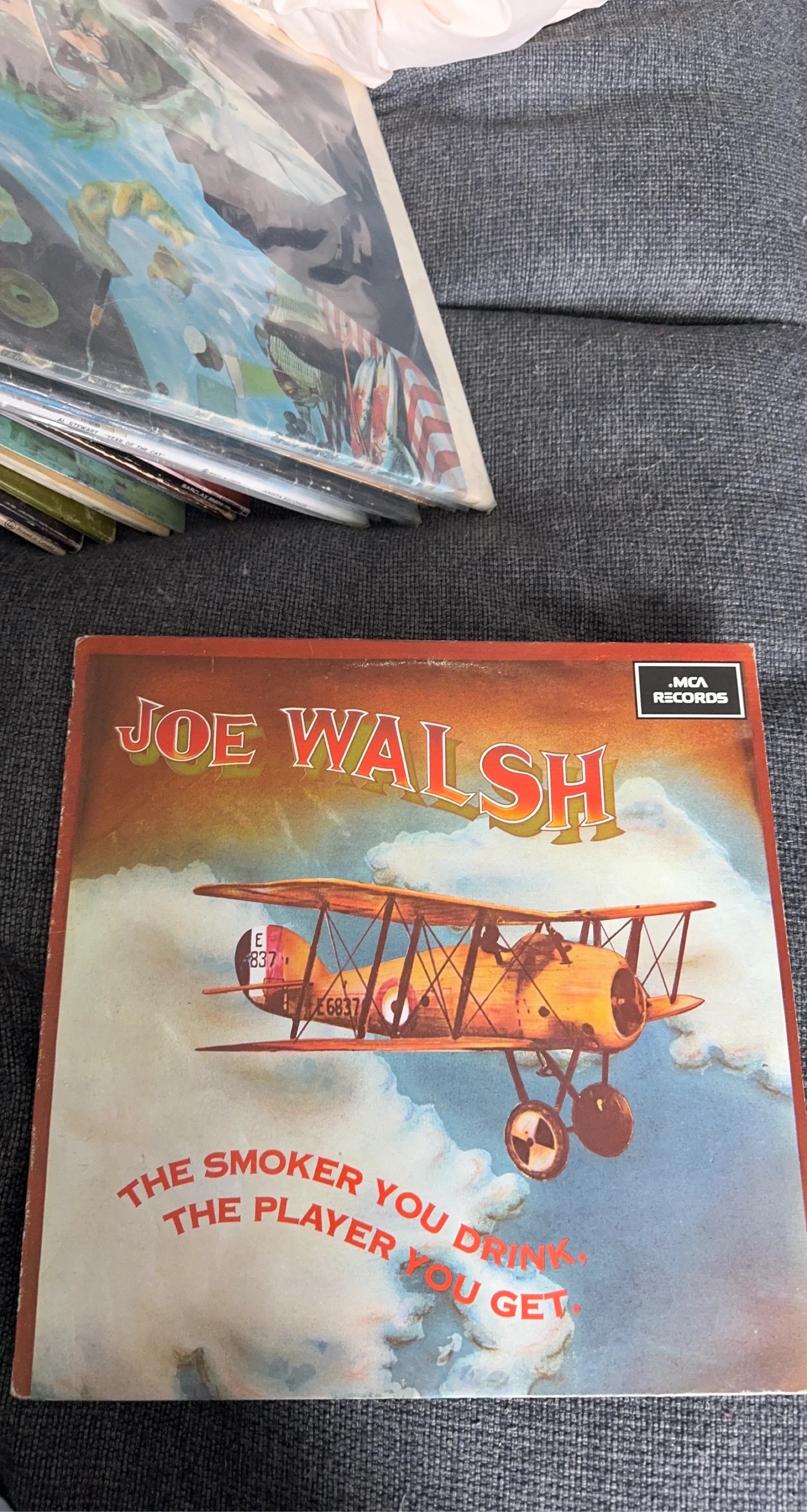 Joe Walsh's 1973 album, 'The Smoker You Drink, The Player You Get'. This vinyl record features tracks like Rocky Mountain Way and Meadows. Produced by Joe Walsh and Bill Szymczyk.