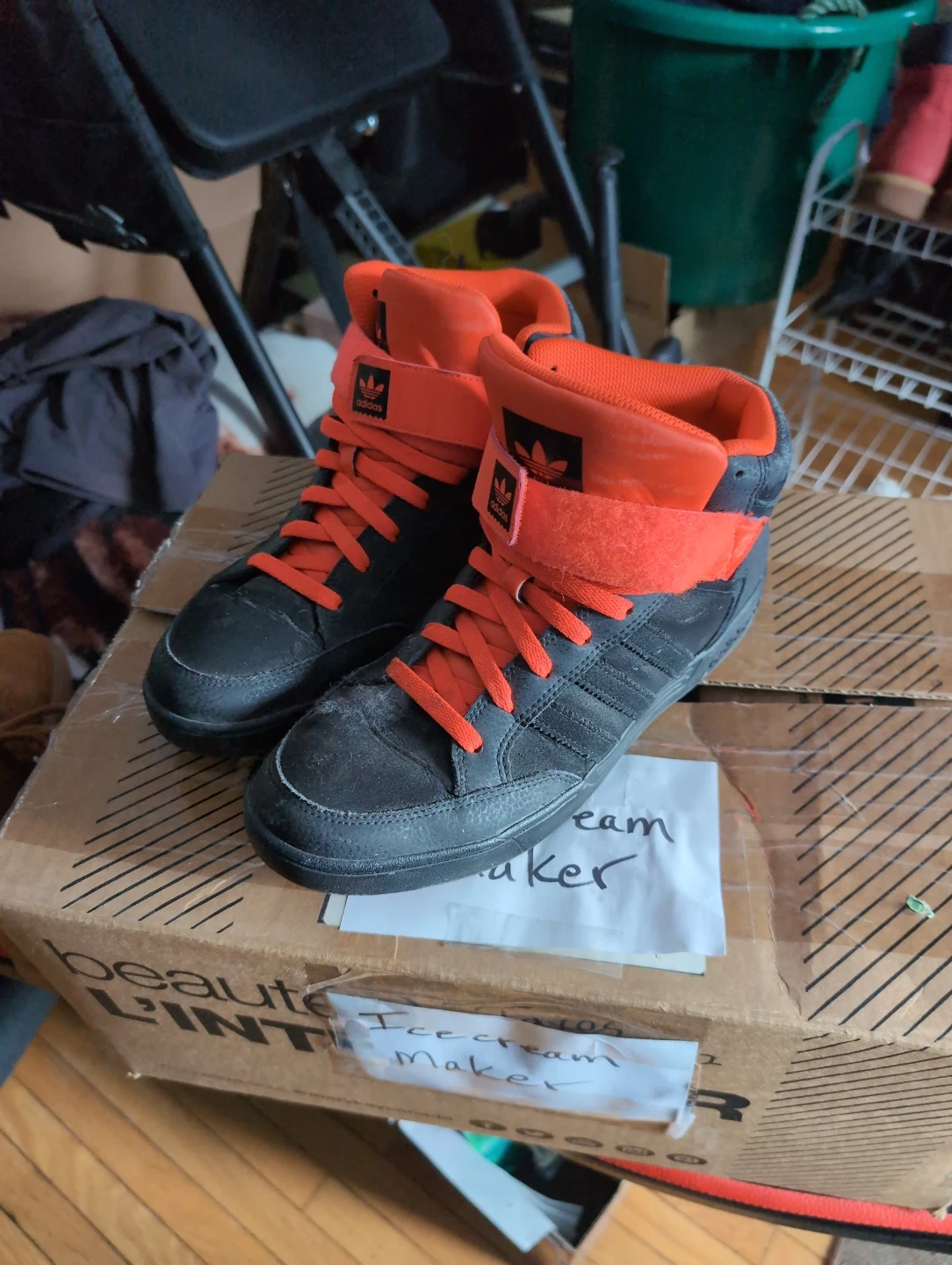 Black Adidas high-top sneakers with orange accents and laces. These shoes have a velcro strap closure over the laces. Durable rubber soles for good grip. Size 10. Signs of wear but overall great condition. Asking $60