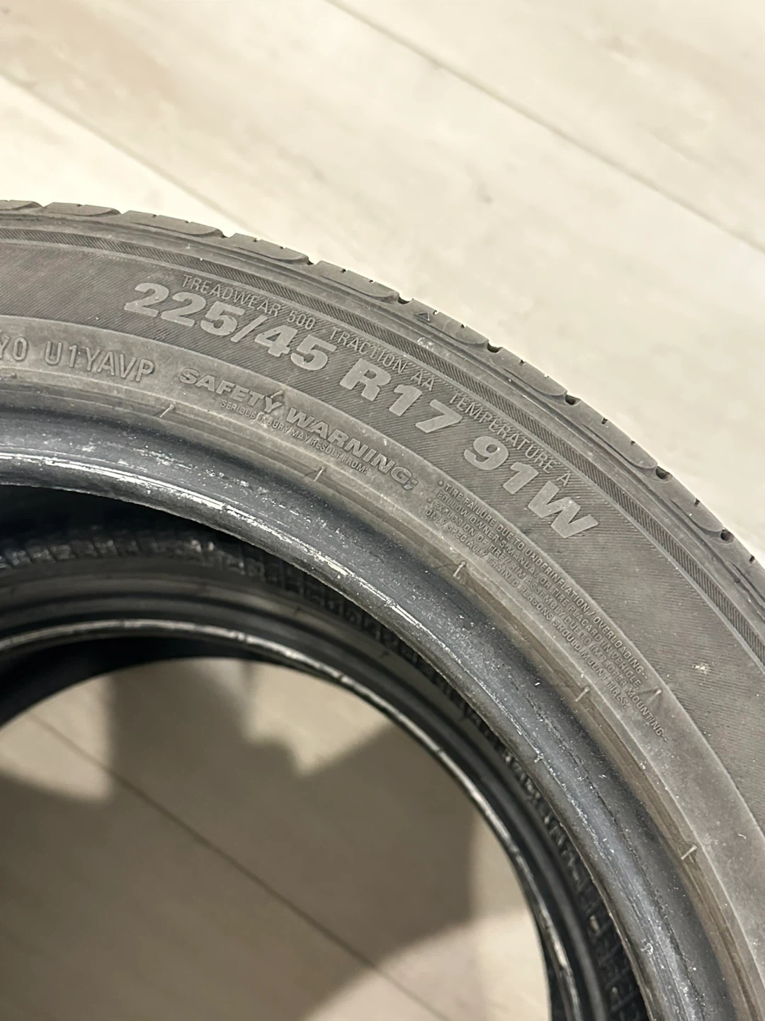 Two Kumho Majesty tires, size 225/45 R17 91W. These are good quality tires for your vehicle!