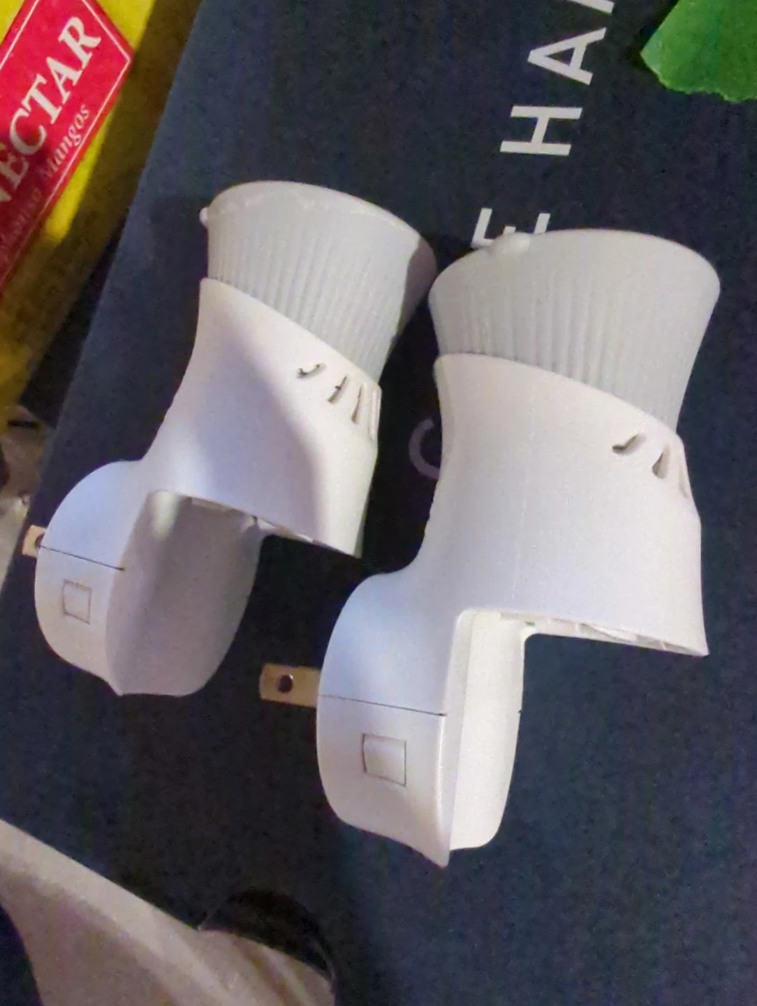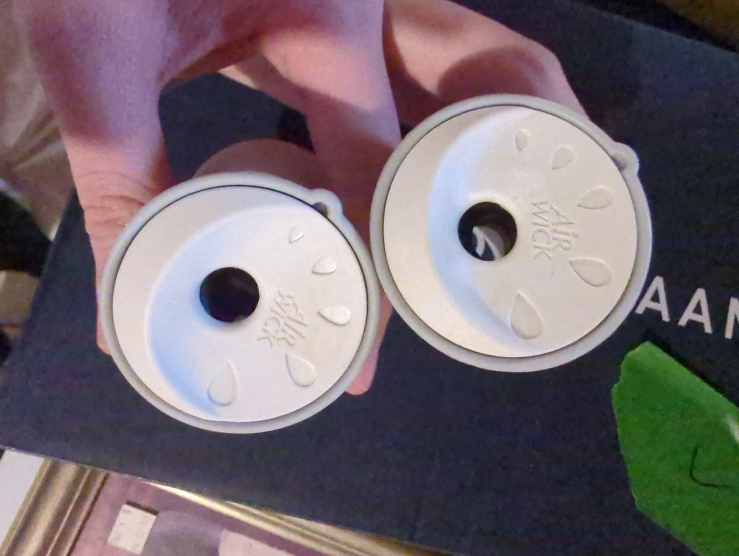 Two Air Wick plug-in air fresheners. White plastic construction with ribbed top. Standard North American plug prongs.