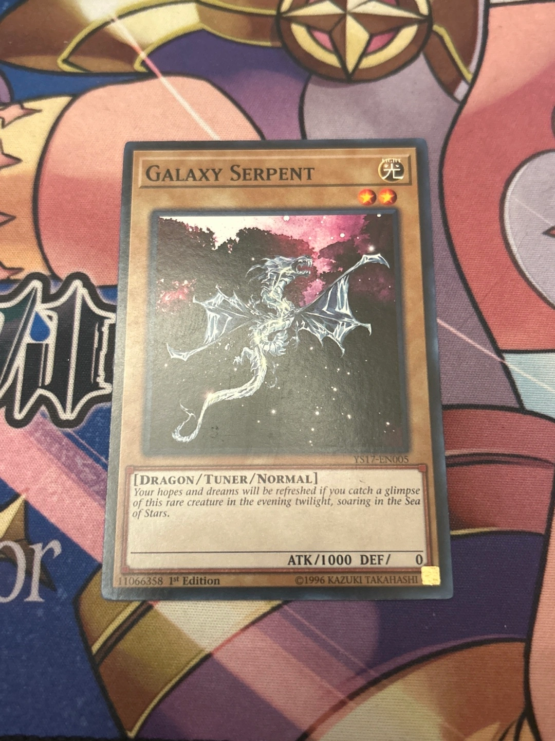 Selling a Galaxy Serpent Yu-Gi-Oh! card. It's a Dragon/Tuner/Normal type card with 1000 ATK and 0 DEF. A great addition to any Yu-Gi-Oh! collection!