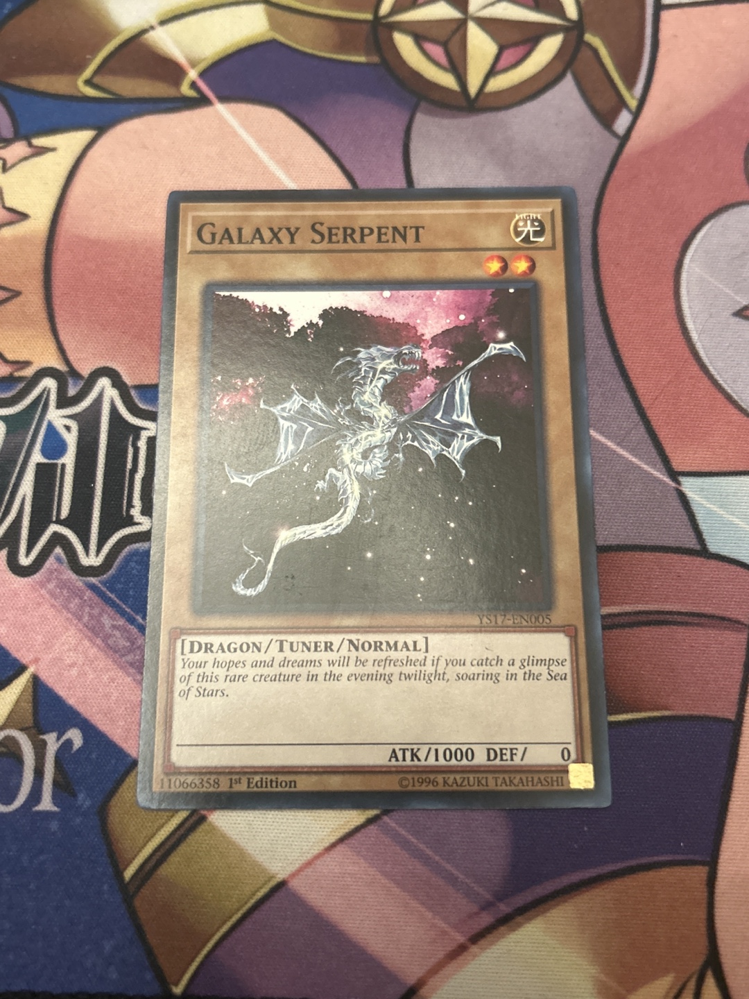 Selling a Galaxy Serpent Yu-Gi-Oh! card. It's a Dragon/Tuner/Normal type card with 1000 ATK and 0 DEF. A great addition to any Yu-Gi-Oh! collection!