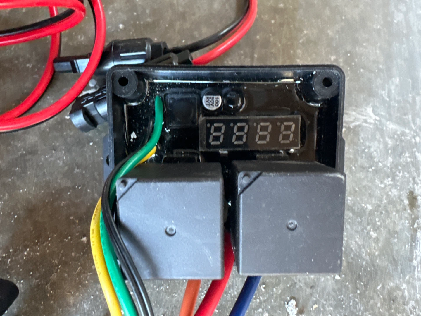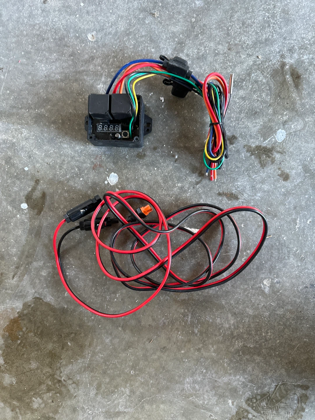 This is a dual relay timer module with a digital display. It comes with the necessary wiring harness and fuses. This unit is designed for applications requiring timed control of two separate circuits.