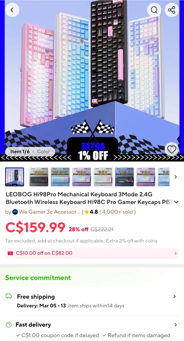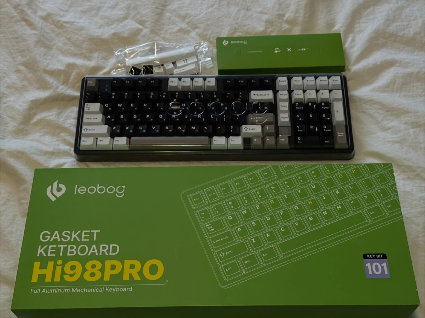 LEOBOG x AULA Hi98PRO mechanical keyboard with gasket mount design. It's a 3-mode 2.4G wireless and Bluetooth mechanical keyboard. This full aluminum keyboard has RGB backlighting and comes with extra keycaps.