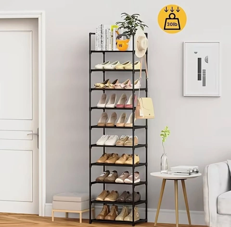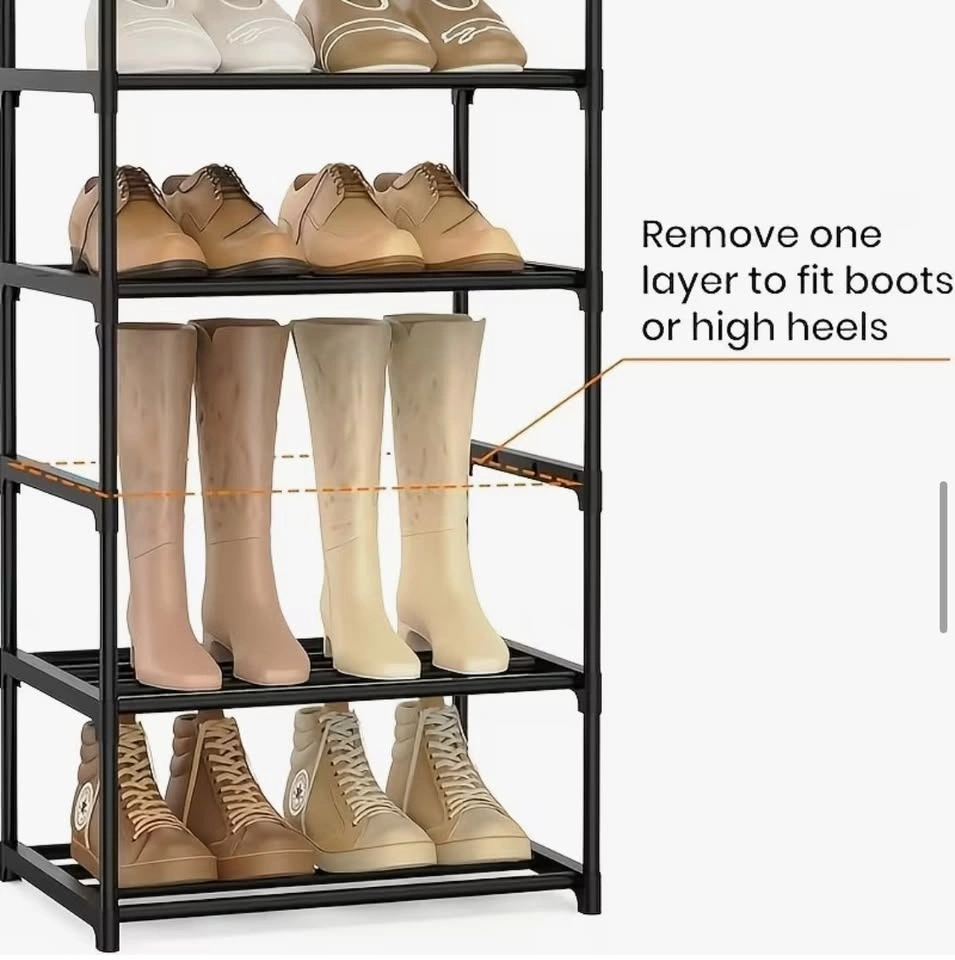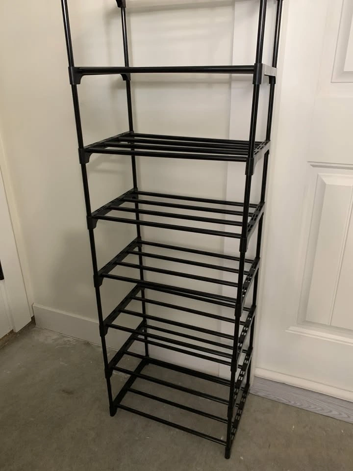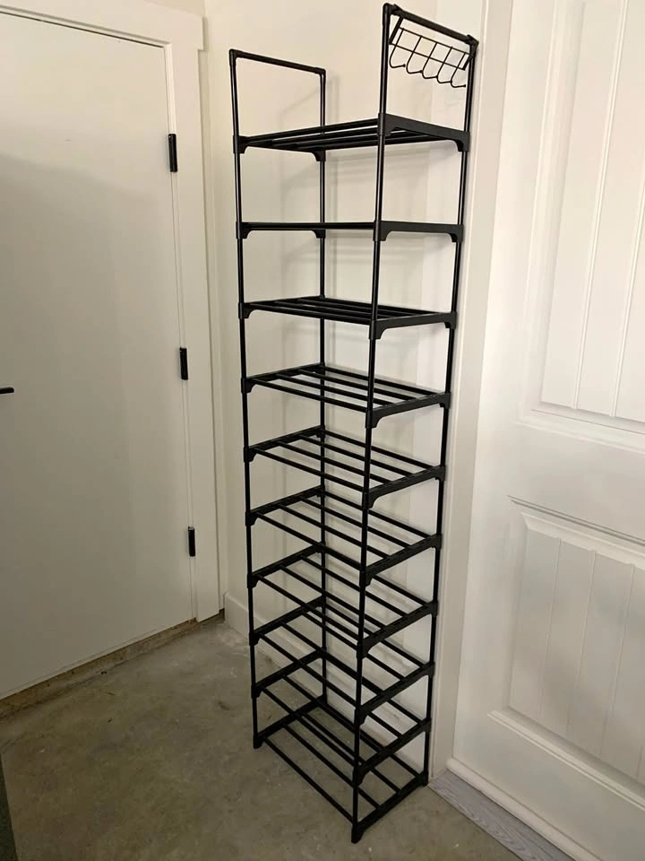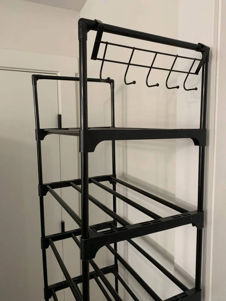 It features a sleek and sturdy frame with shelves that hold shoes or other household items.