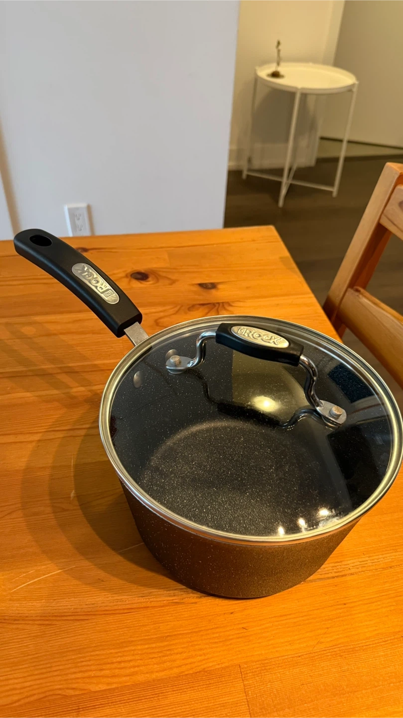 This is The Rock saucepan with a tempered glass lid. It's got a non-stick coating and a comfortable handle. Size is 2L.