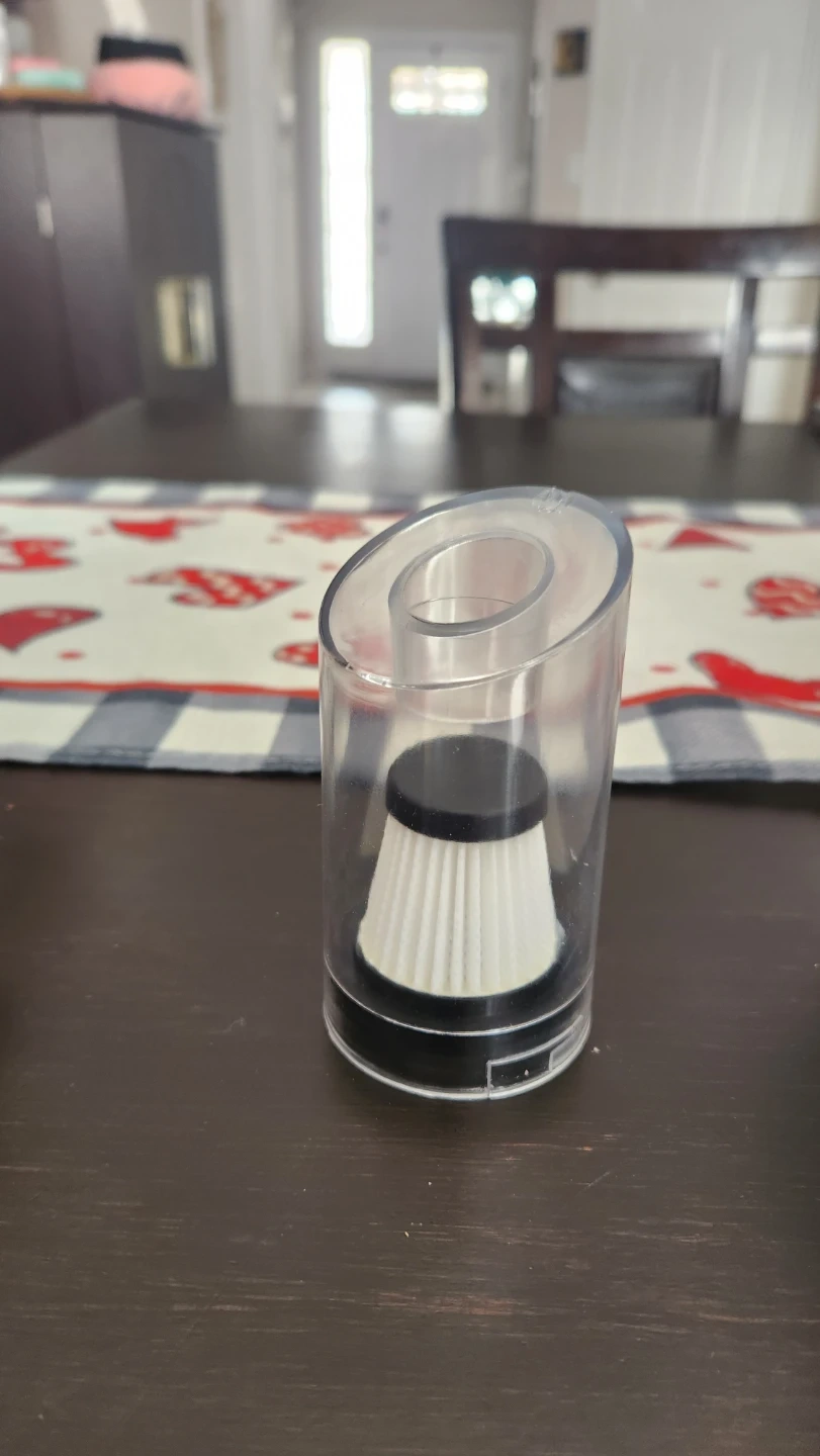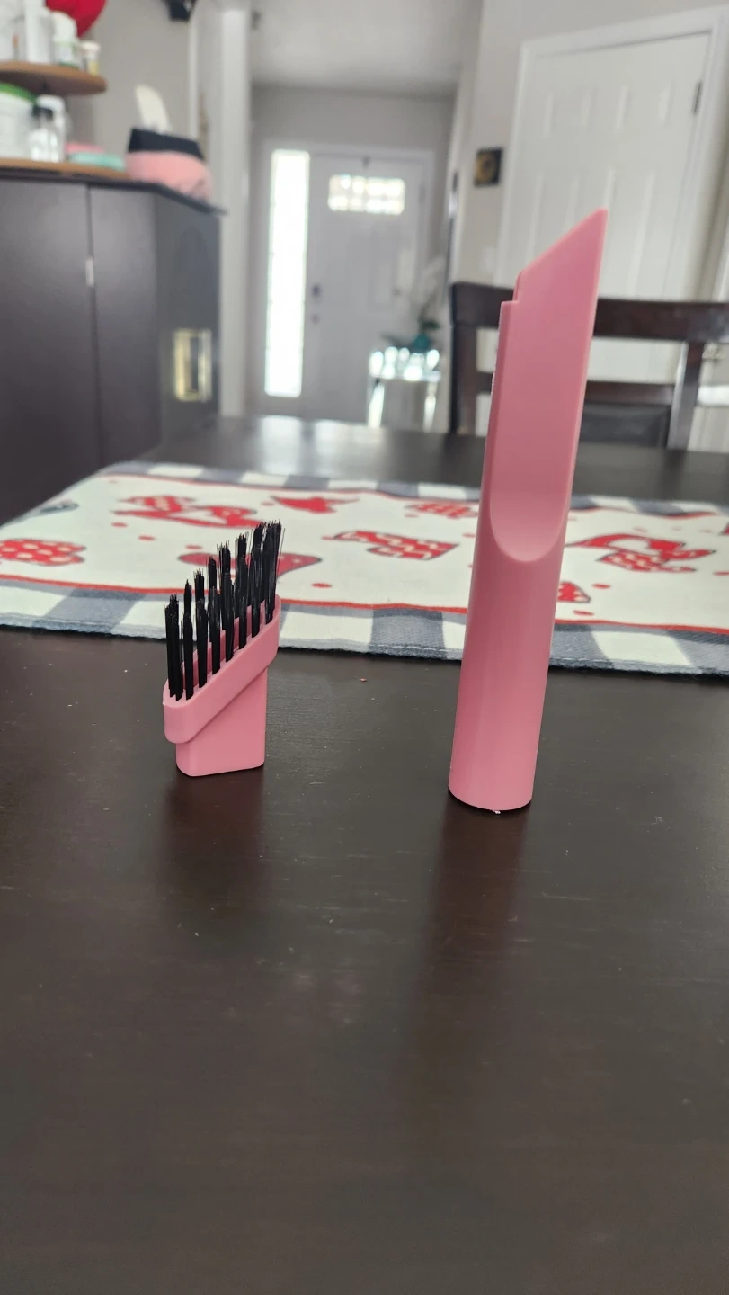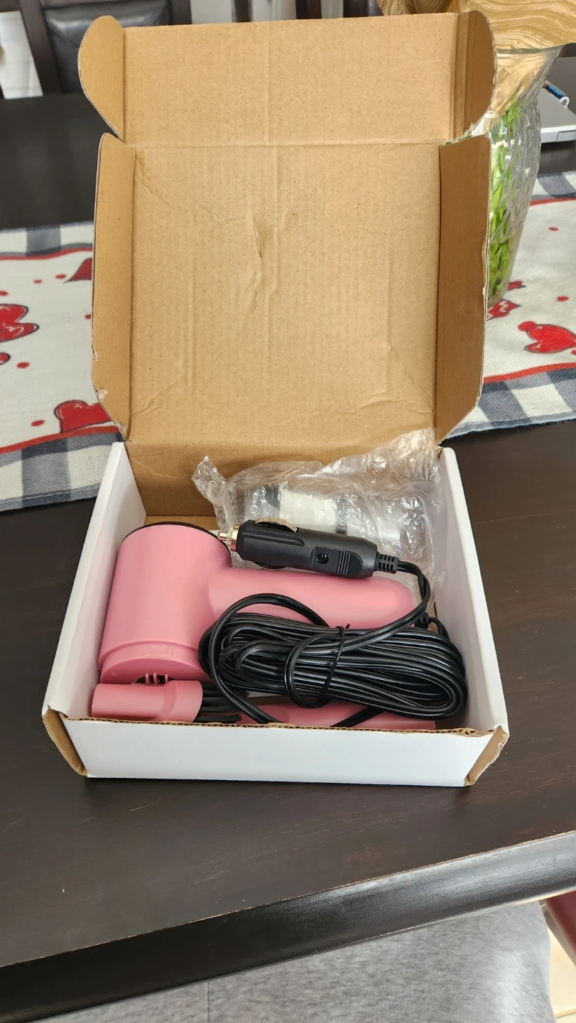 This is a pink car vacuum cleaner. It comes with a crevice tool and a brush attachment. It plugs into your car's 12V outlet for power. It's great for cleaning up small messes in your vehicle!