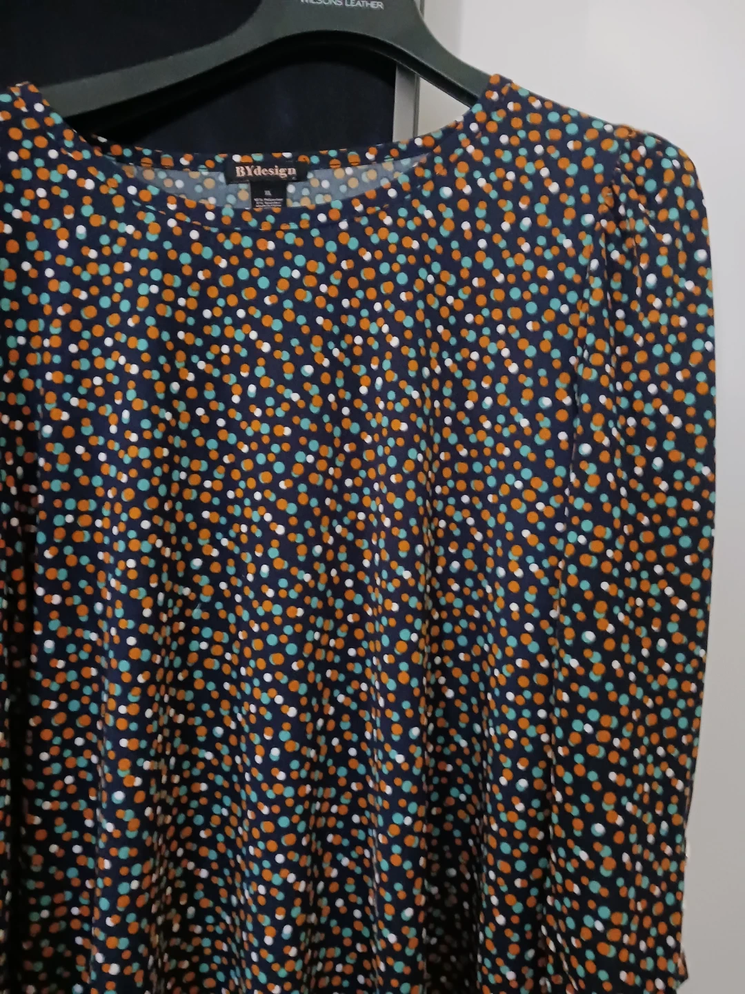 This BY DESIGN women's long sleeve top comes in a navy blue base with a scattered dot print featuring orange, teal, and white. It has a relaxed fit and decorative button details on the cuffs. Size is medium. It's great for casual wear.