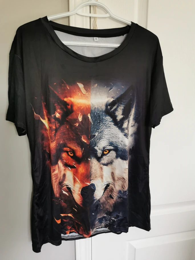 This new XL black T-shirt features a striking wolf design, split between fire and ice, making it a unique statement piece.