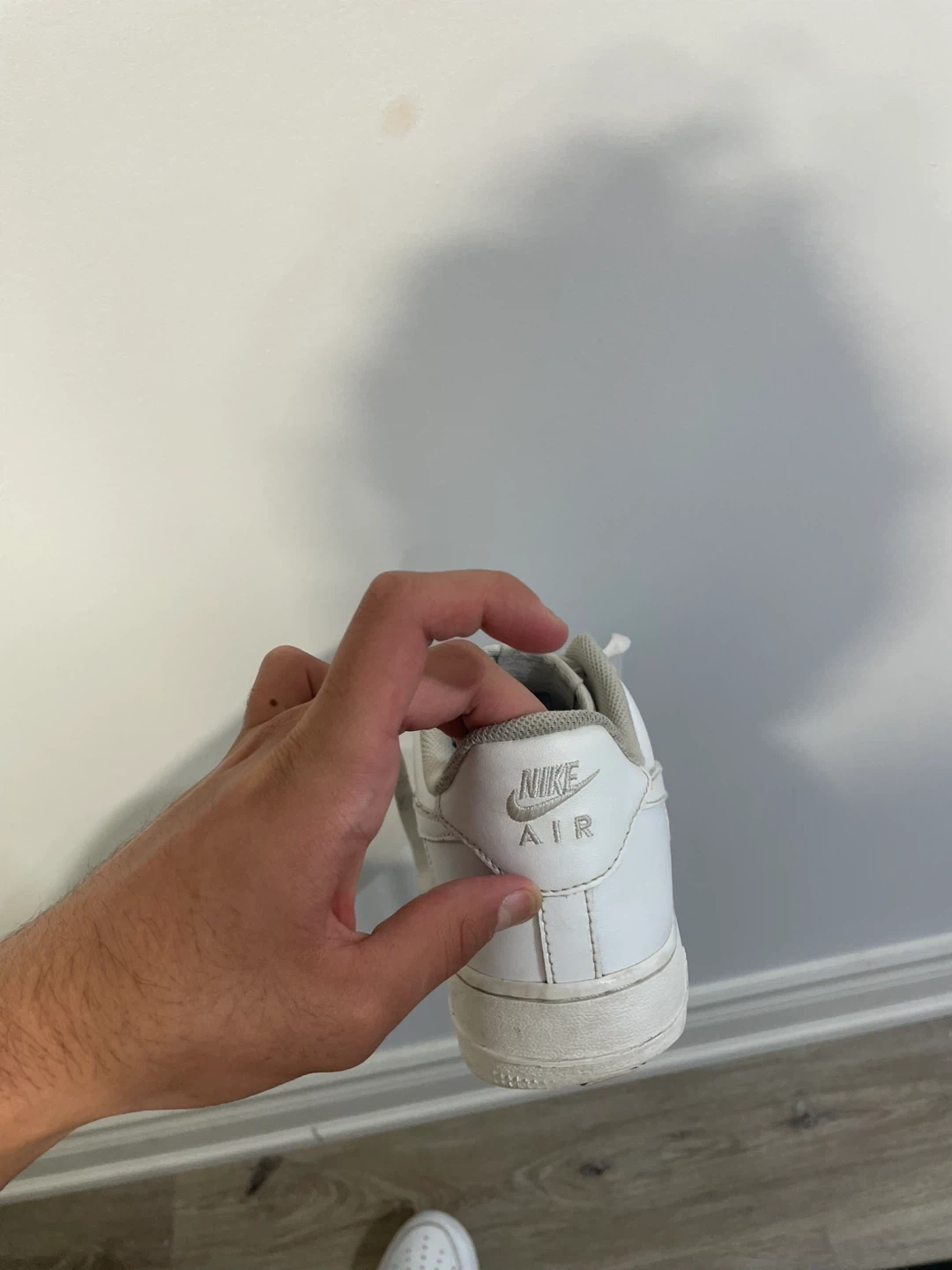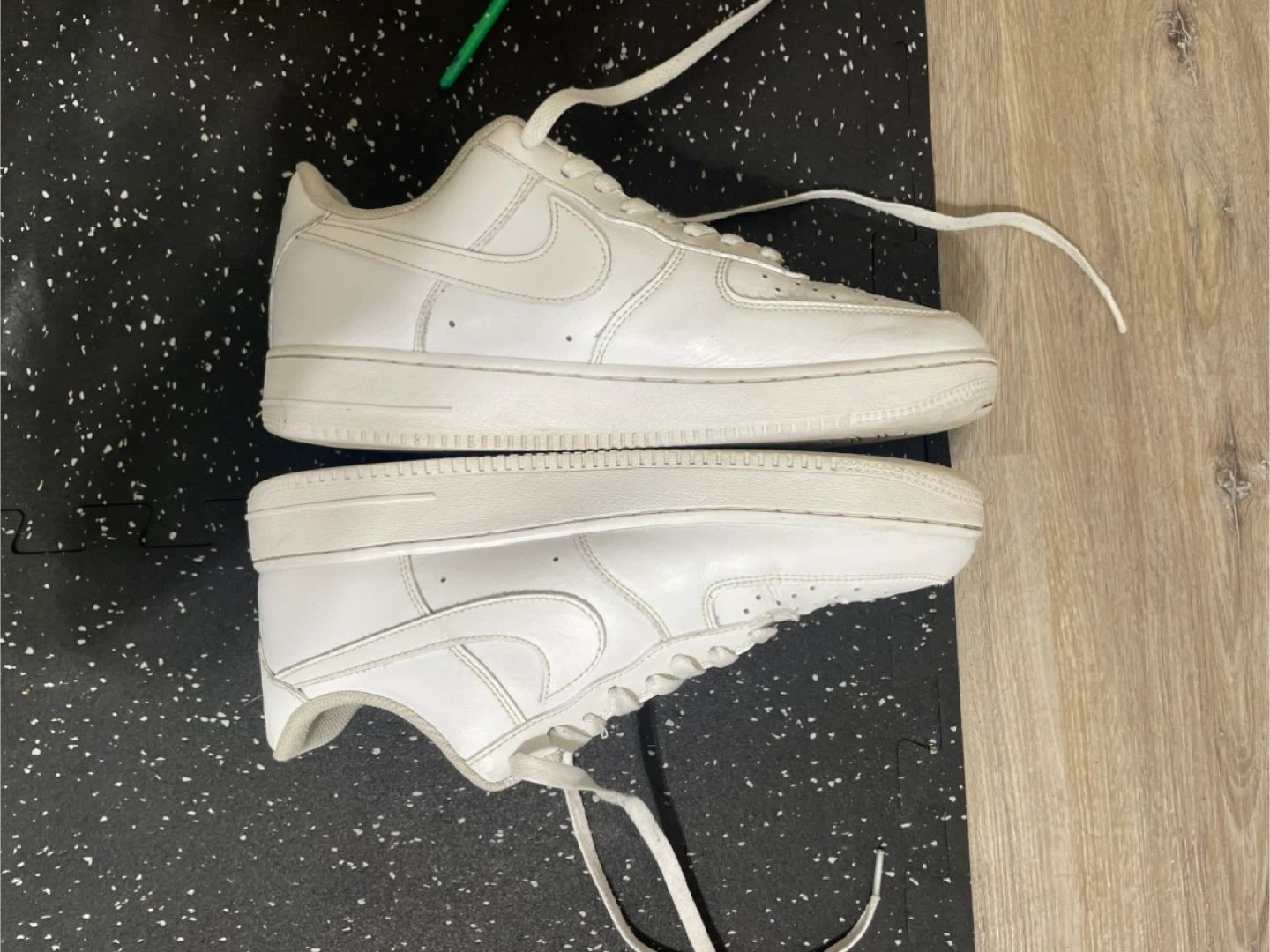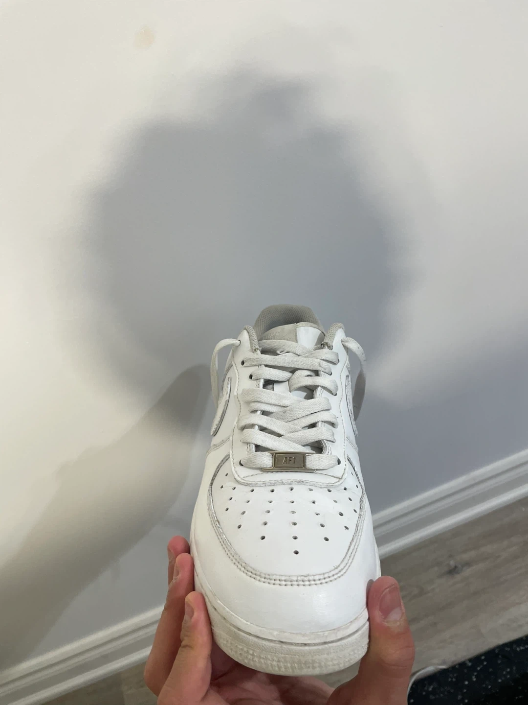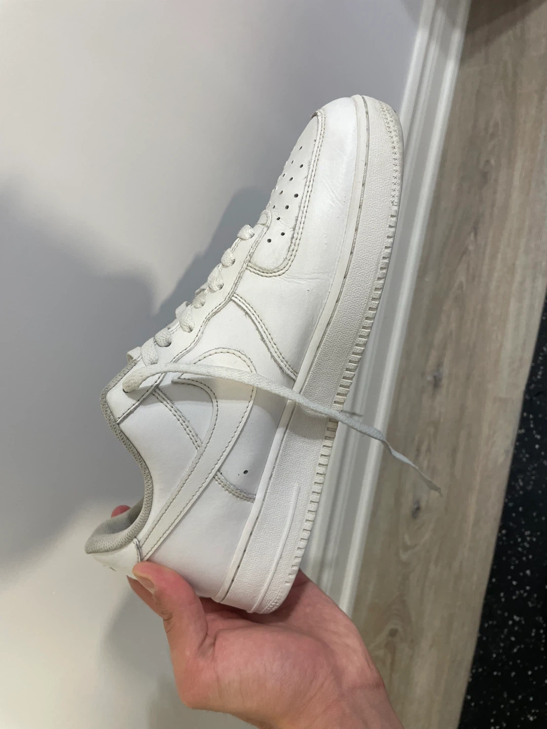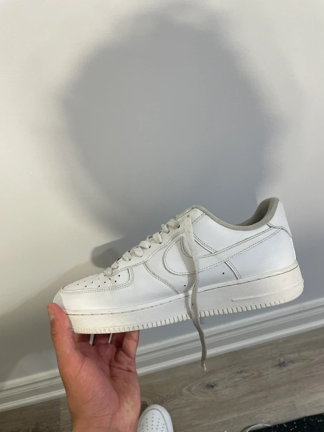 Classic white Nike Air Force 1 sneakers. These are a staple for any sneaker collection. Leather upper and rubber sole.
