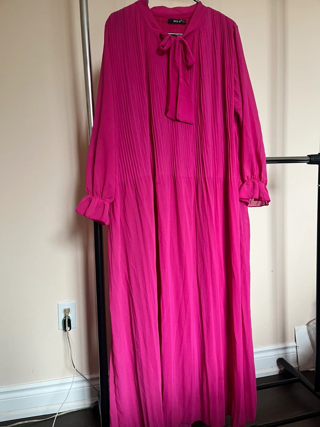 This is a lovely pink maxi dress with a pleated design. It features a pussy bow tie at the neckline and ruffled cuffs on the long sleeves. The dress is a vibrant shade of pink and has a flowing silhouette. Perfect for Baby Shower 🌸