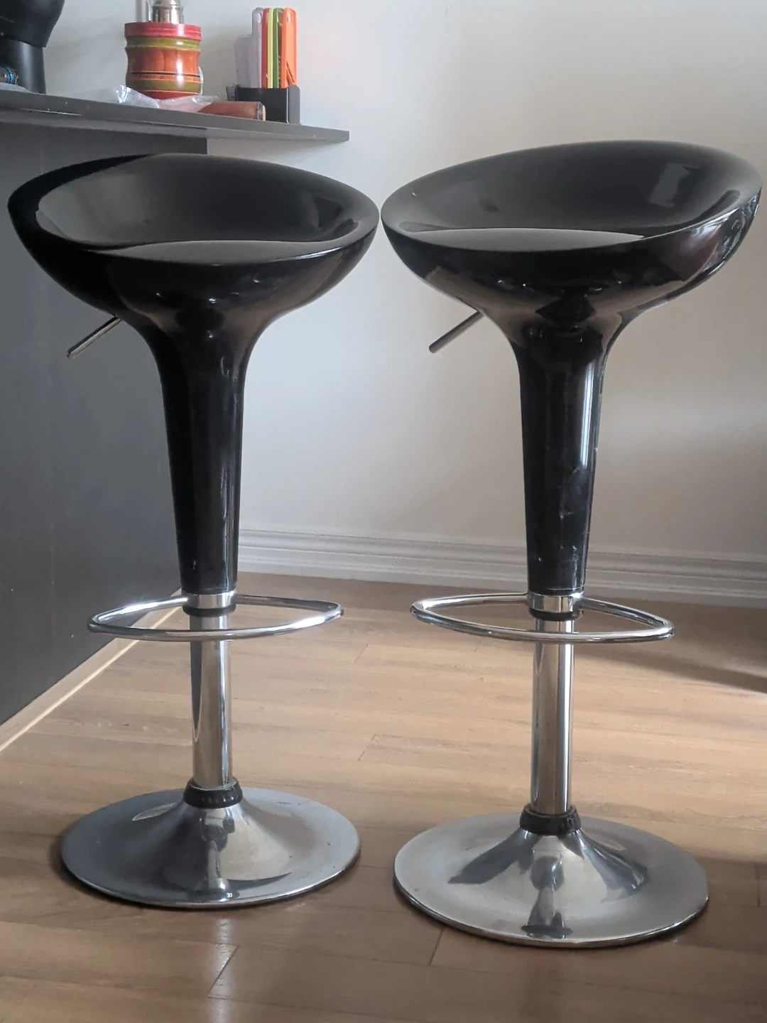 This is a set of two black adjustable bar stools. They feature a sleek, modern design with chrome bases and footrests. The seats are made of durable, glossy plastic. These stools would be great for a kitchen island or home bar!
