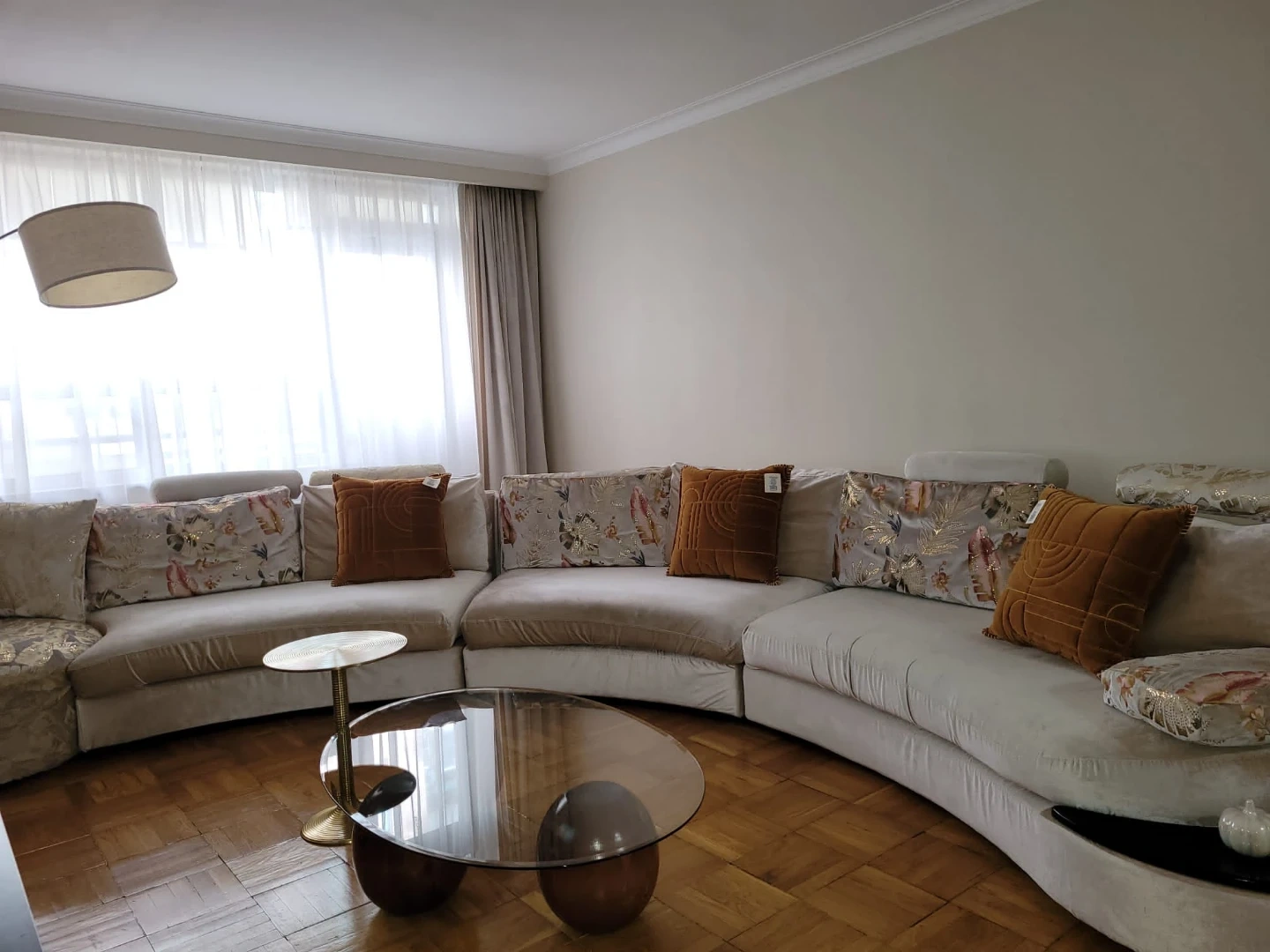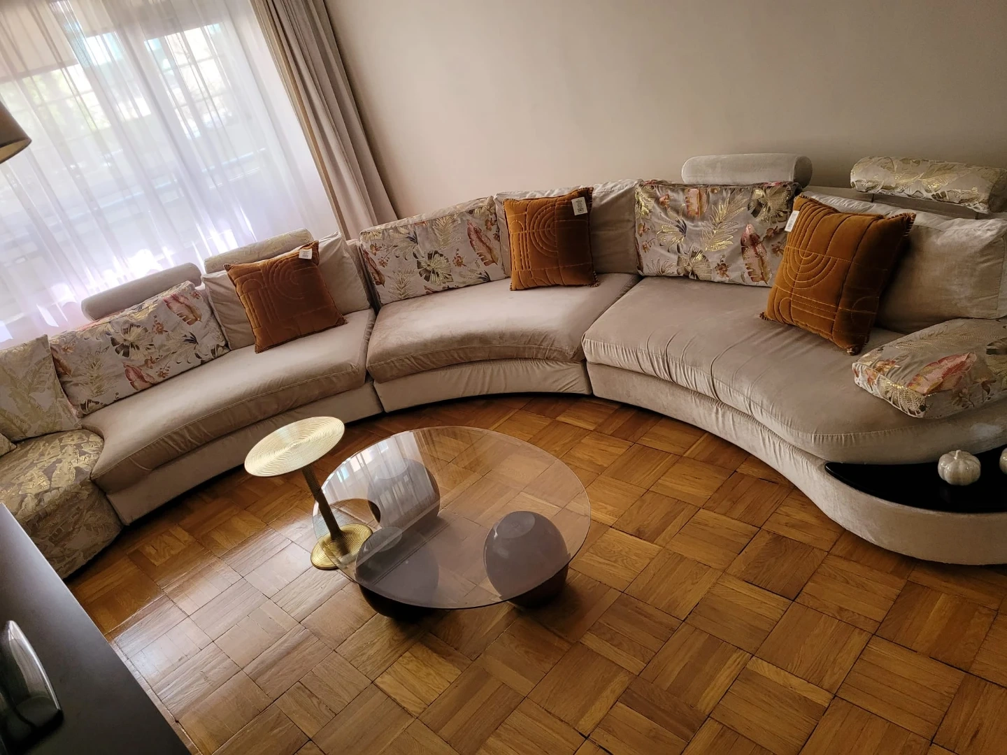 Selling a stylish curved sectional sofa in beige. The sofa features a unique design with embroidery and decorative pillows. Spacious and comfortable, it's a great piece to add to any living space!