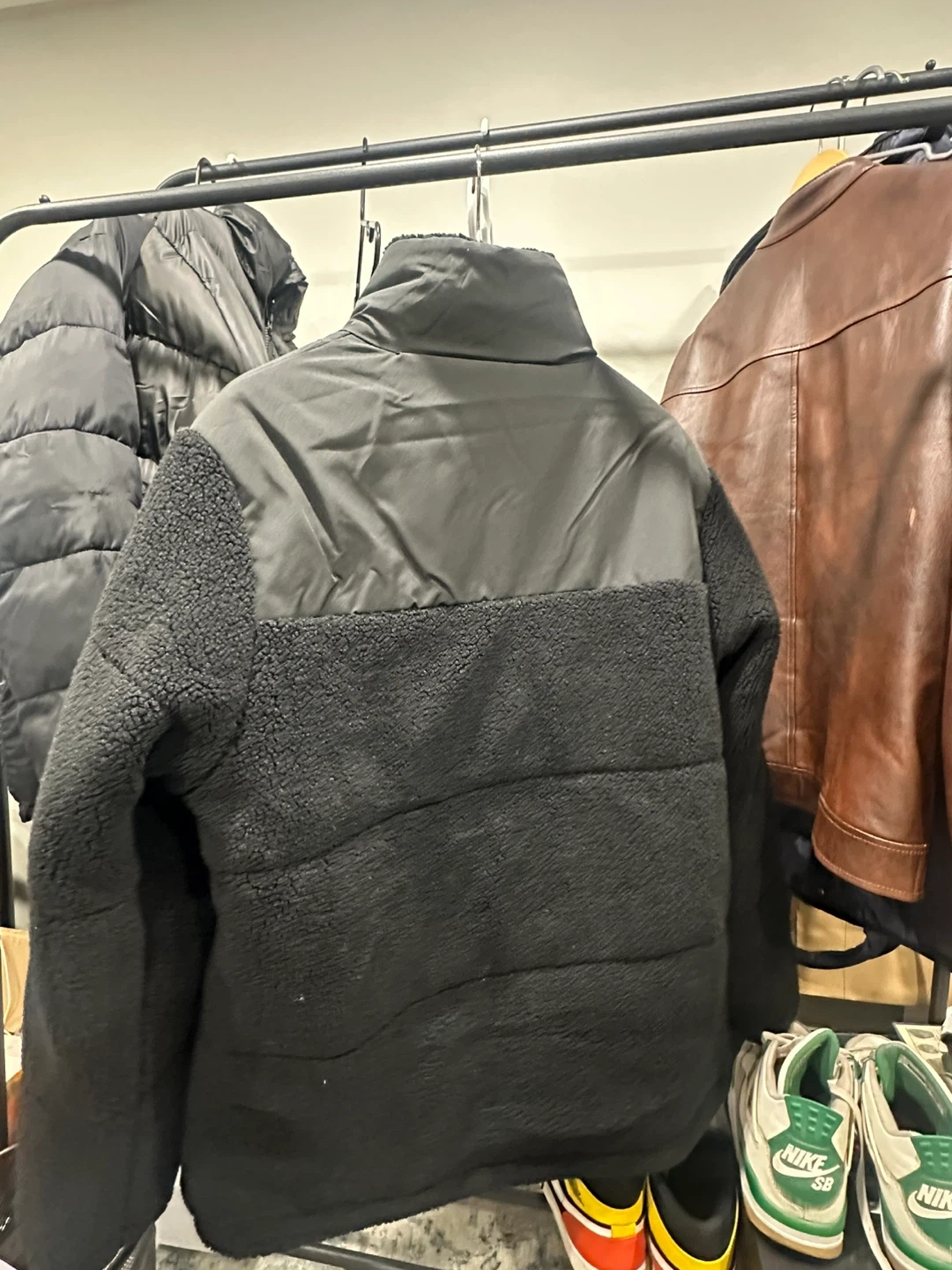 A cozy dark blue fleece jacket from The North Face. It's made with a sherpa fleece material on the lower half and a smooth nylon overlay on the upper chest and shoulders. It has a full zip front and zippered hand pockets, which is also reversible into a windbreaker. It is negotiable.