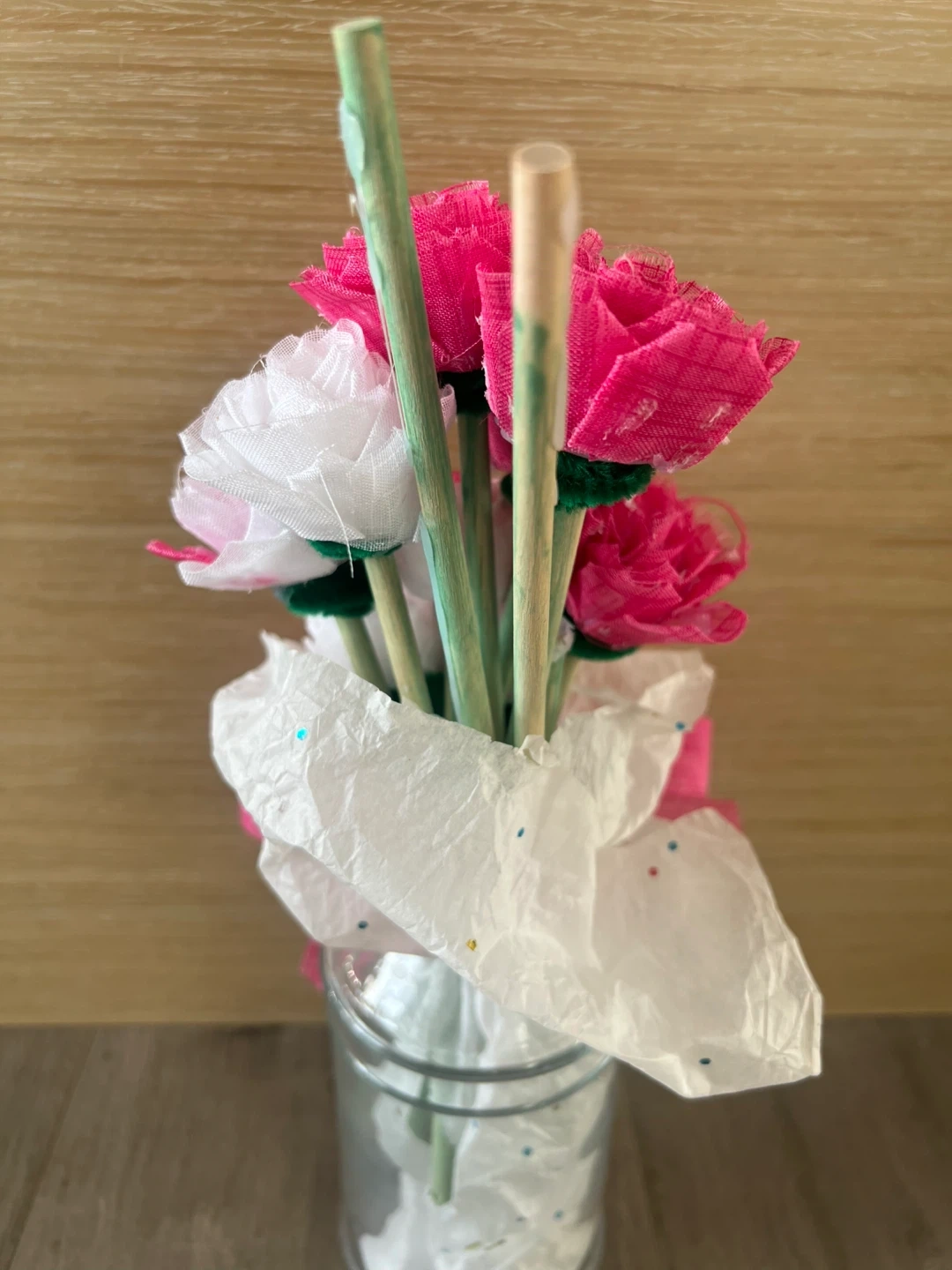 Selling a cute handmade bouquet of pink and white fabric flowers ๐น roses in a vase! It's a charming piece that would look great as a centrepiece or decoration in any room for Valentines Day. Extra sticks were for pictures :)