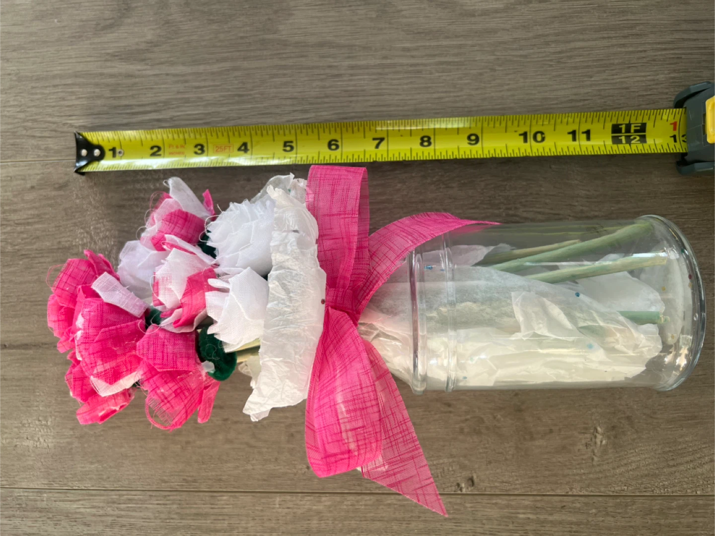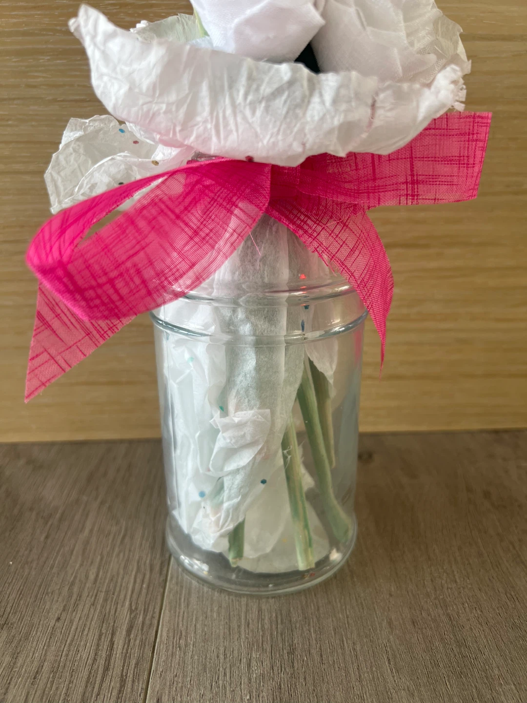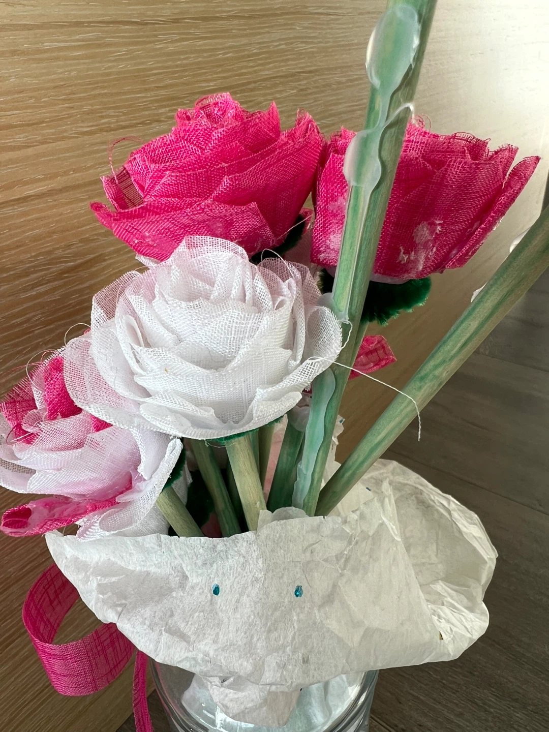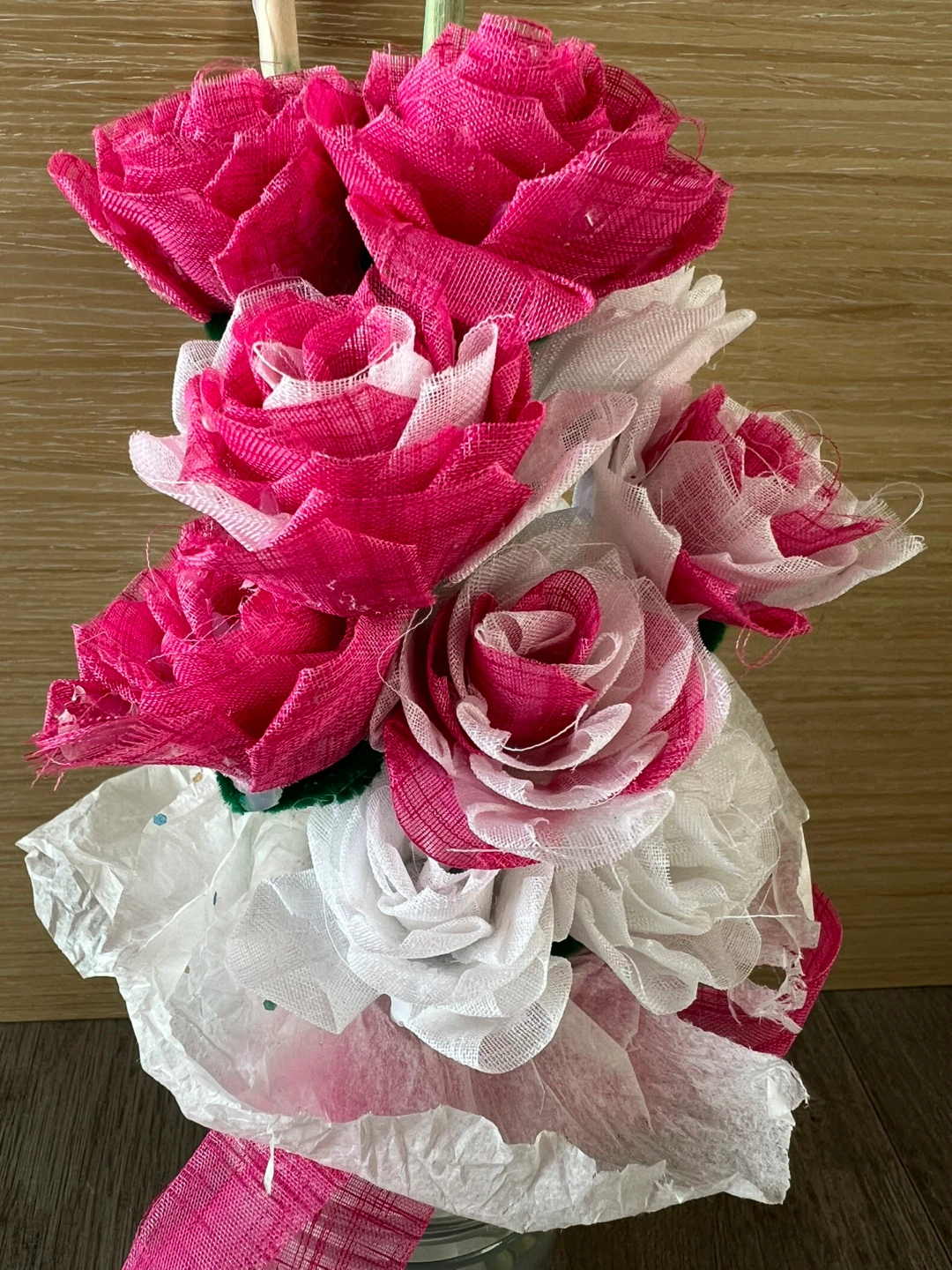 Selling a cute handmade bouquet of pink and white fabric flowers ๐น roses in a vase! It's a charming piece that would look great as a centrepiece or decoration in any room for Valentines Day. Extra sticks were for pictures :)