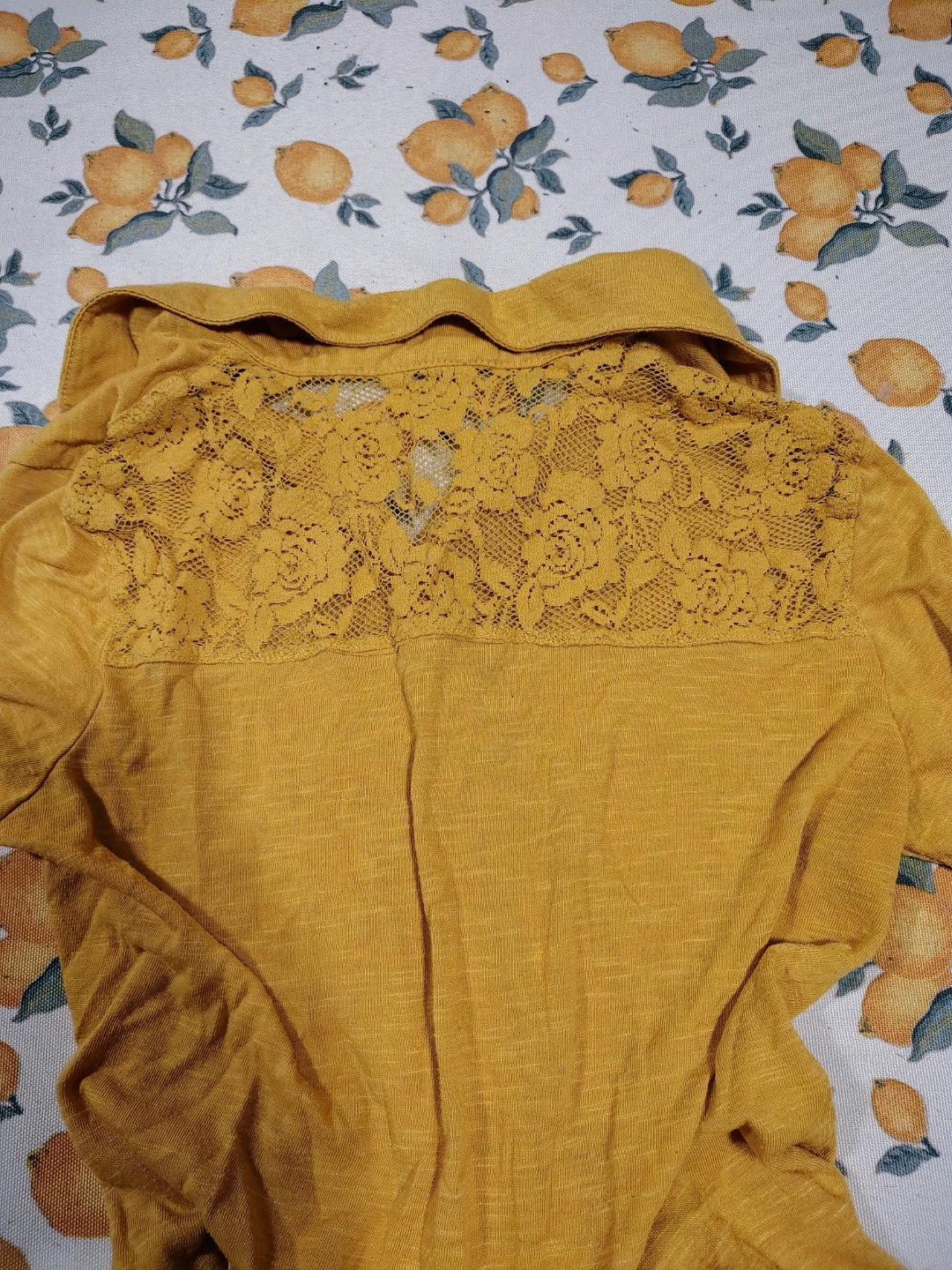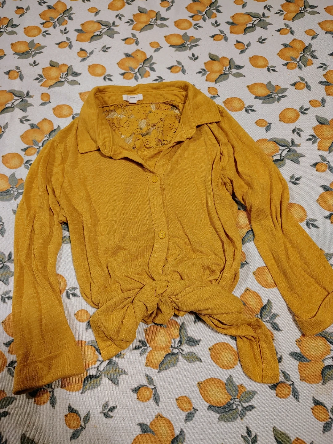 This is a yellow button-up shirt with quarter sleeves. It features a pretty lace panel on the back. The front can be tied at the hem.