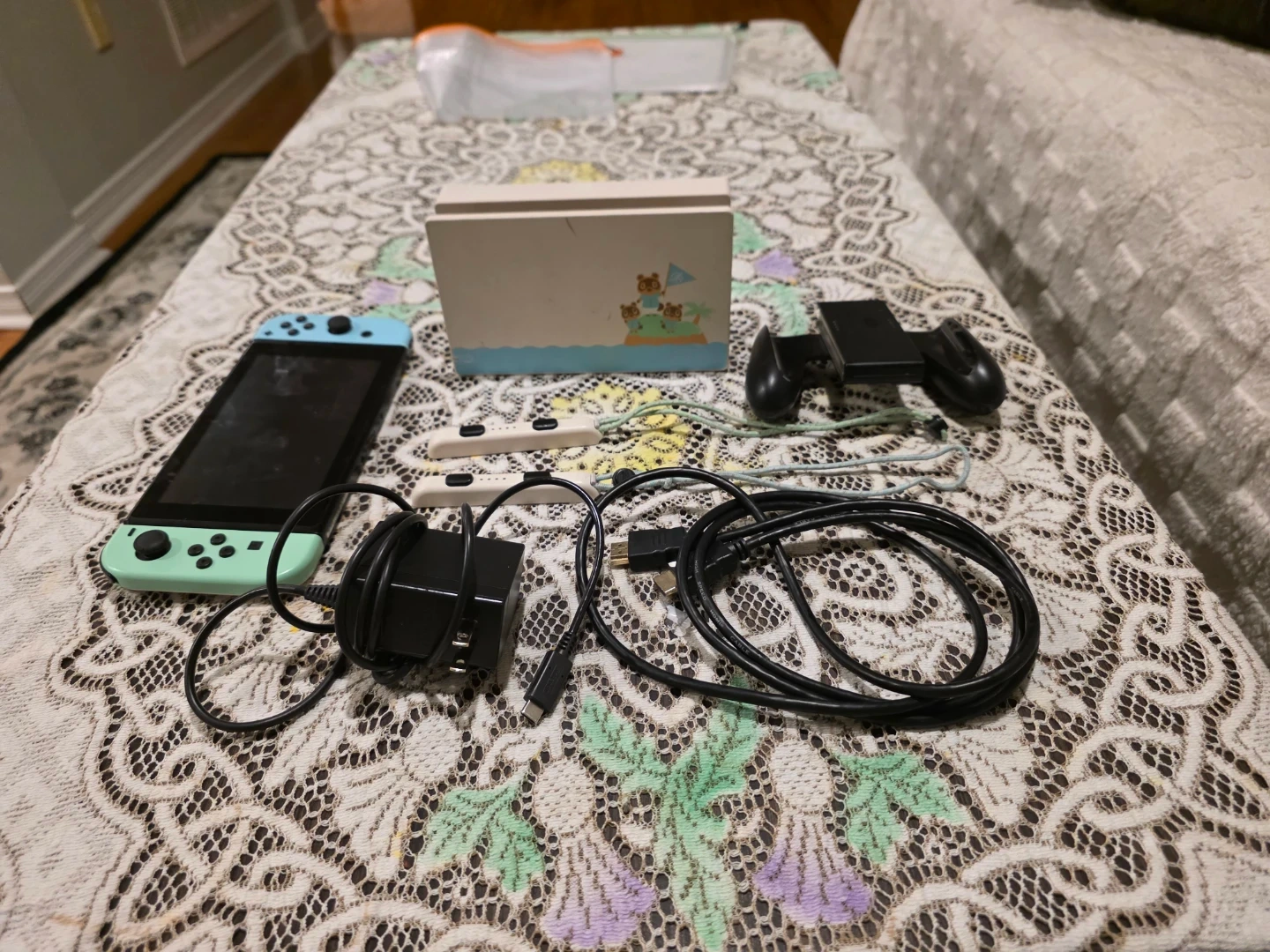Selling a Nintendo Switch console with the blue and green joy-cons. It's in used condition with some signs of wear. Perfect for gaming on the go or at home!