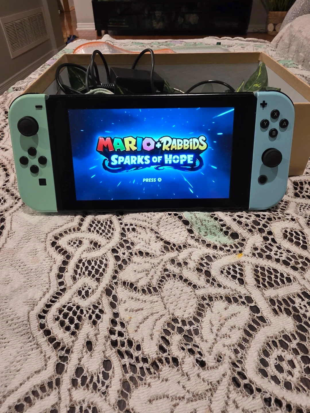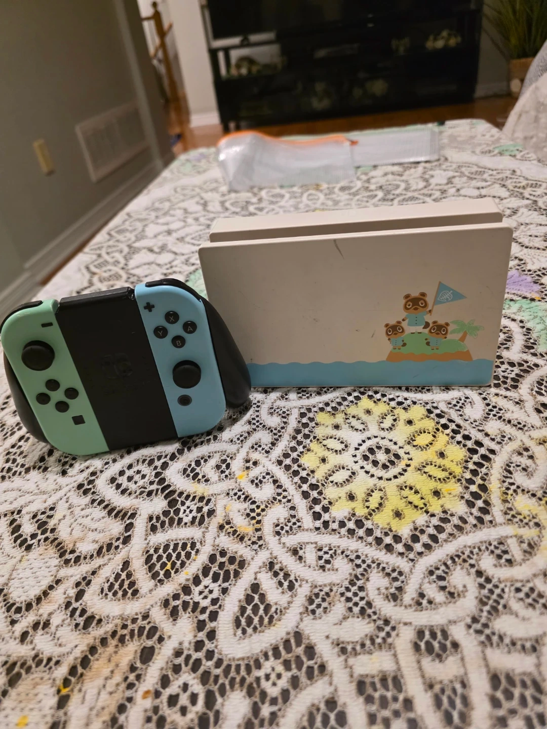 Selling a Nintendo Switch console with the blue and green joy-cons. It's in used condition with some signs of wear. Perfect for gaming on the go or at home!