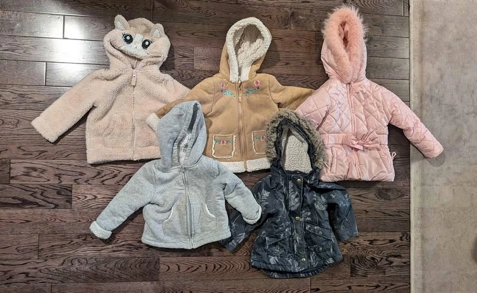 Toddler girls winter and fall jackets. All are size 18-24 months, except the all-pink one which is tagged 12 months but fits 18-24 months. Each jacket is $10. Located near Greenwood and Danforth area