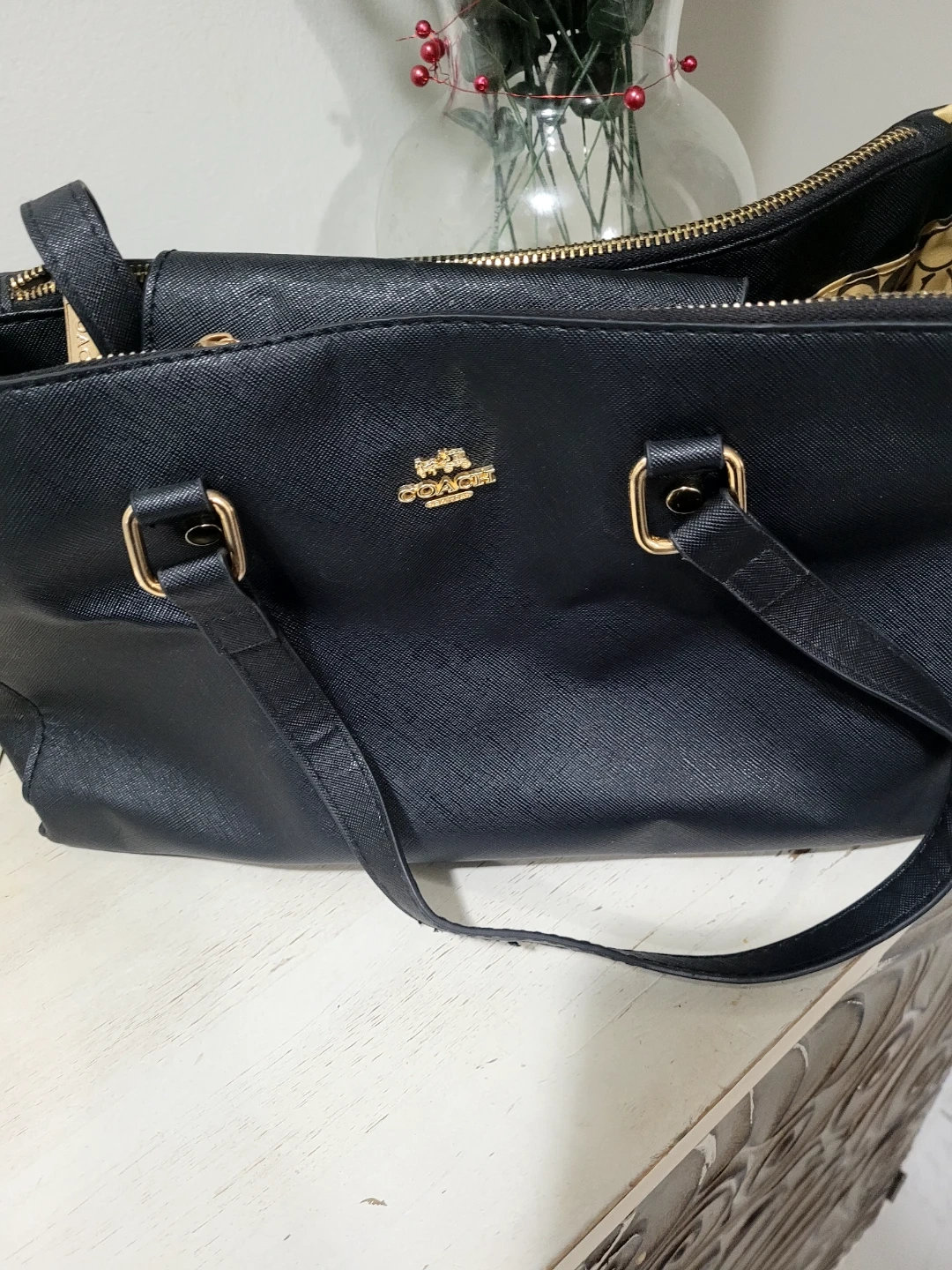 Selling a Coach black leather tote bag! It's in good condition and has gold hardware. Perfect for everyday use or as a work bag. It has a zipper closure and the classic Coach logo on the front.not real
