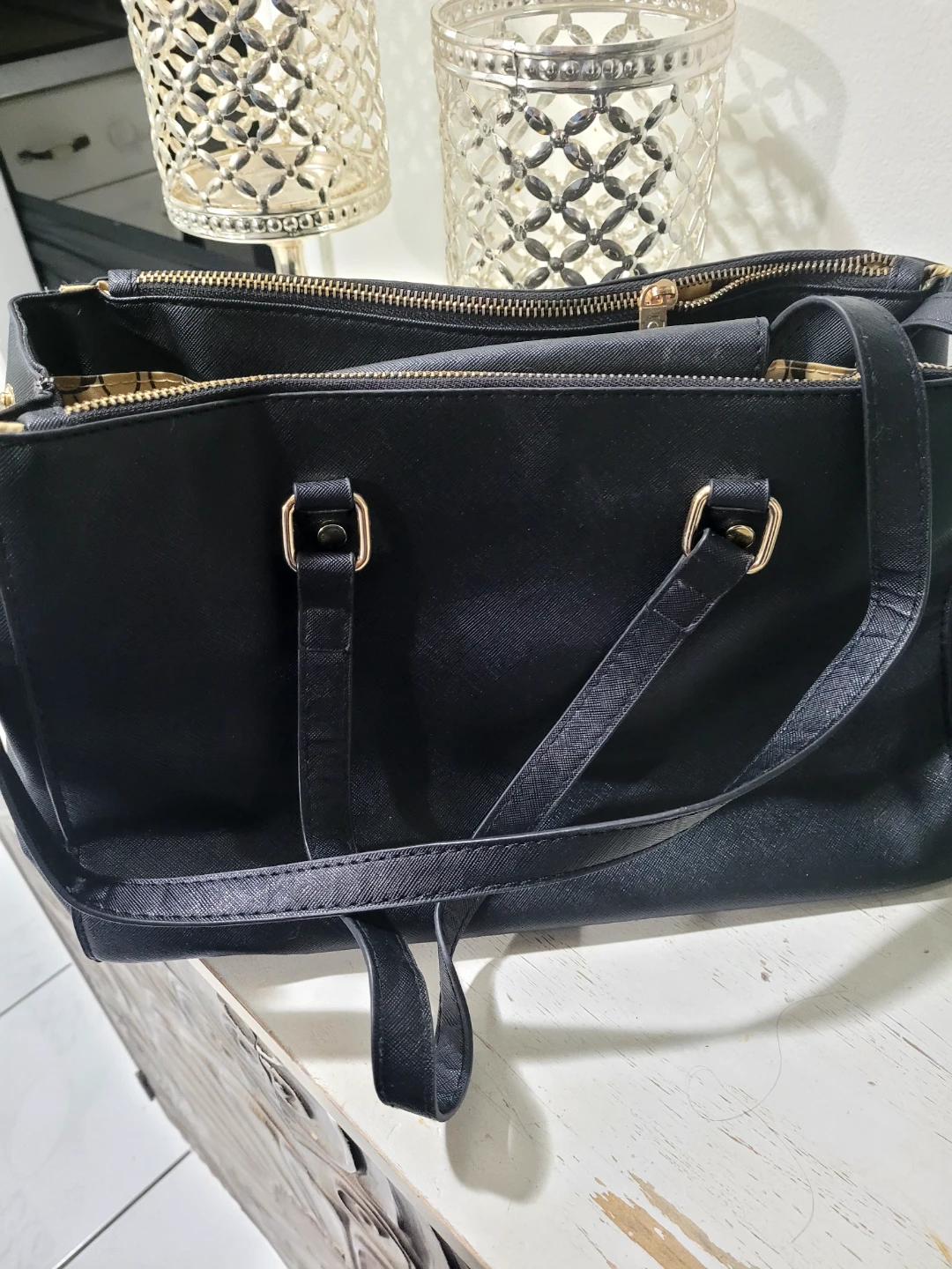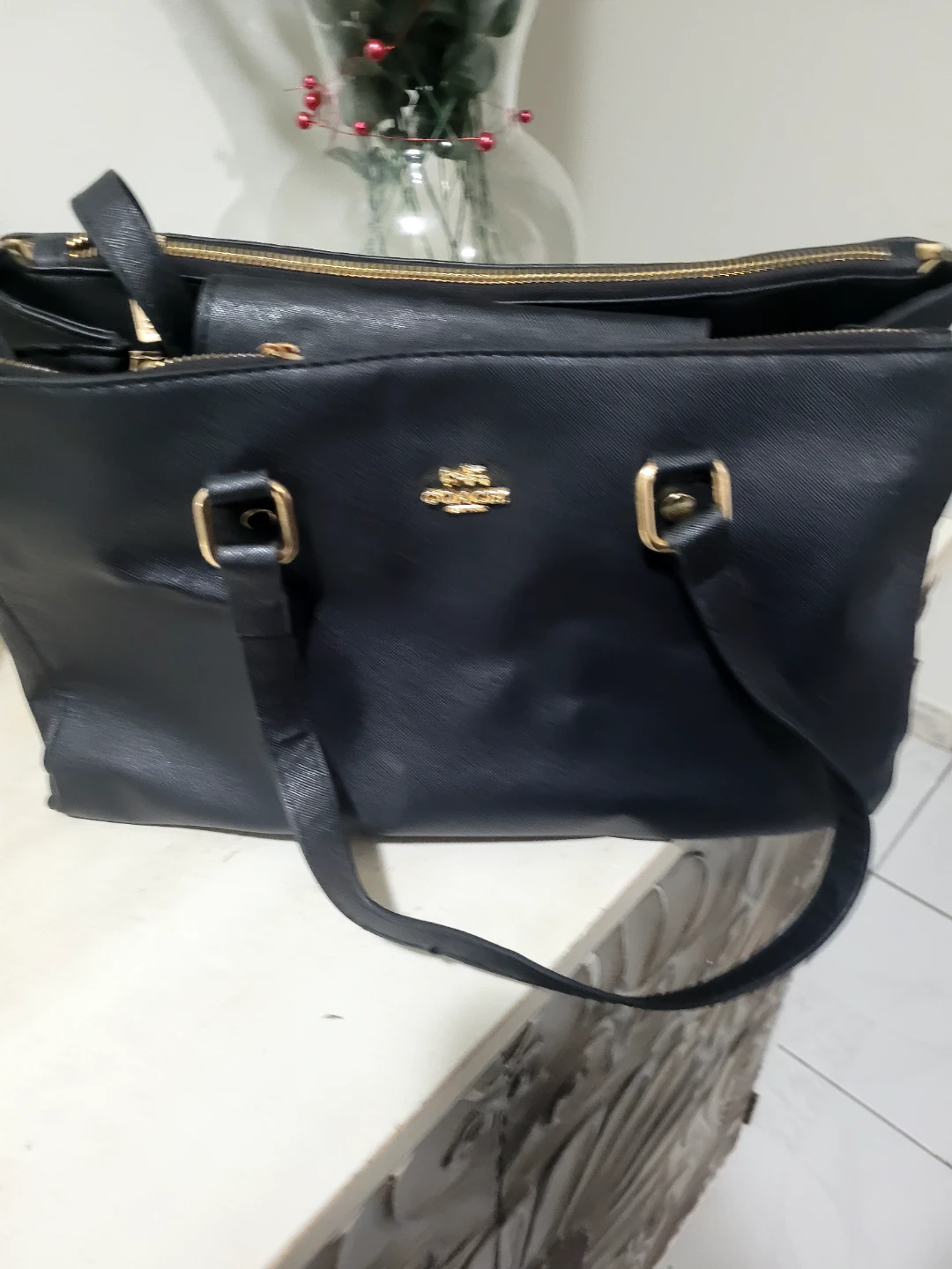 Selling a Coach black leather tote bag! It's in good condition and has gold hardware. Perfect for everyday use or as a work bag. It has a zipper closure and the classic Coach logo on the front.not real