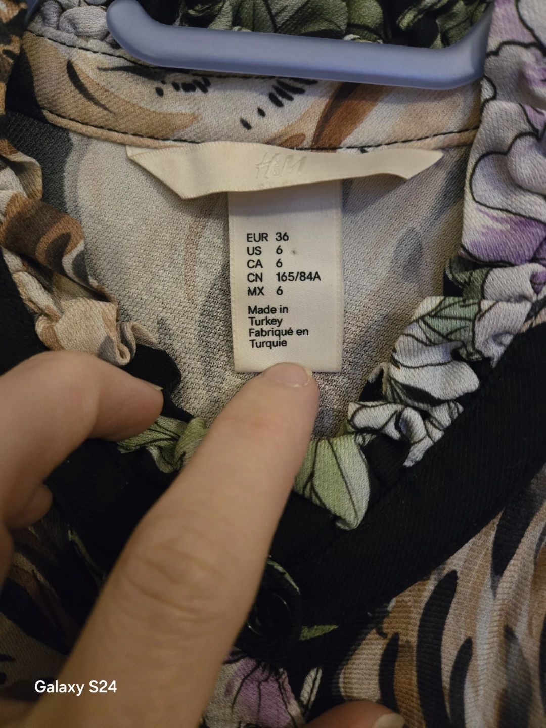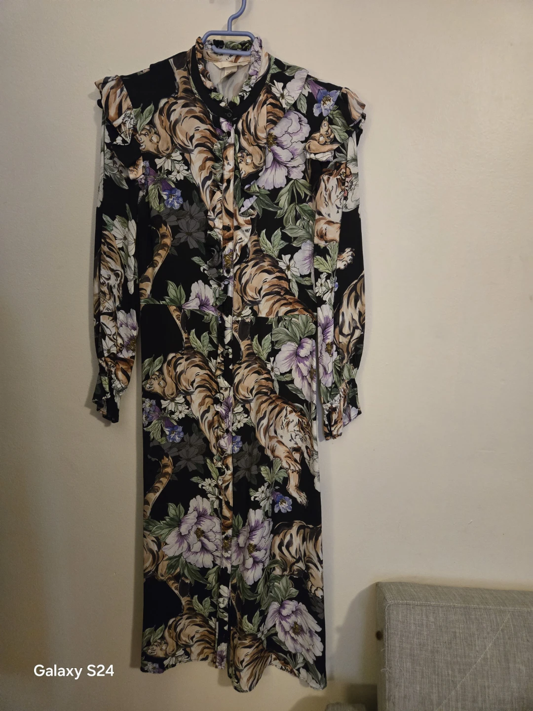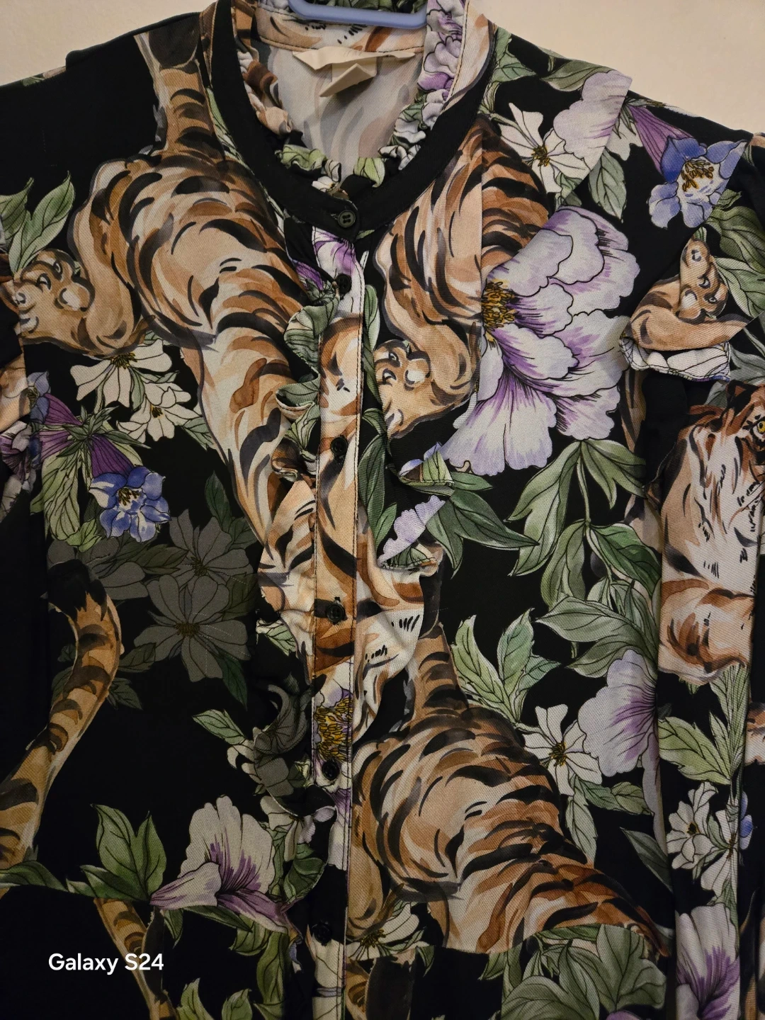 This H&M dress features a bold tiger and floral print on a black background. It's a button-up style with a ruffled collar and cuffs. Size is EUR 36, US 6, CA 6, MX 6.