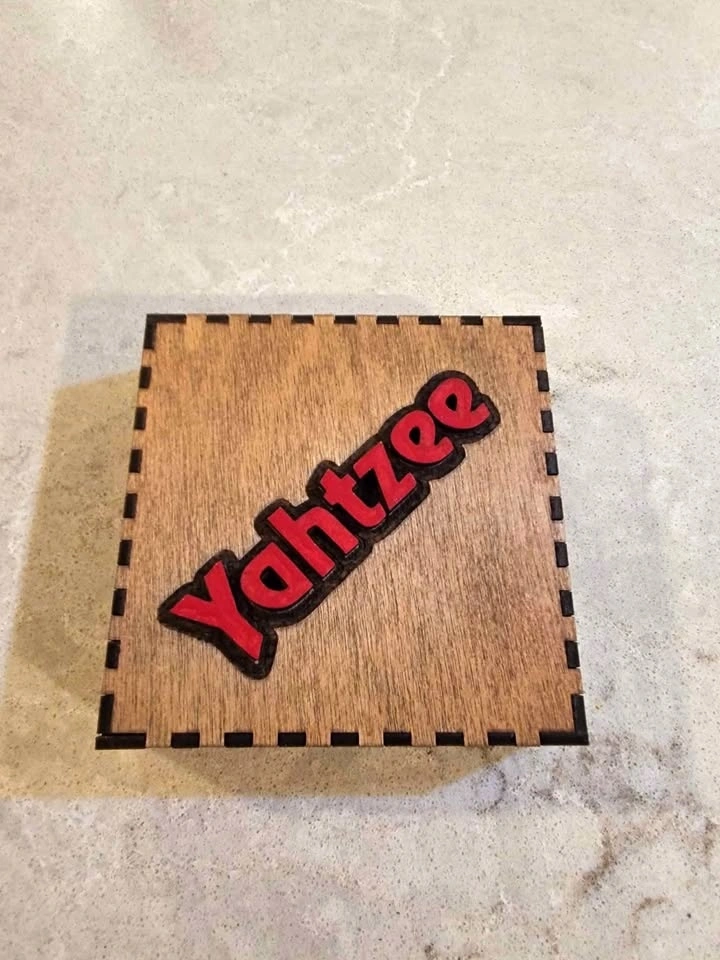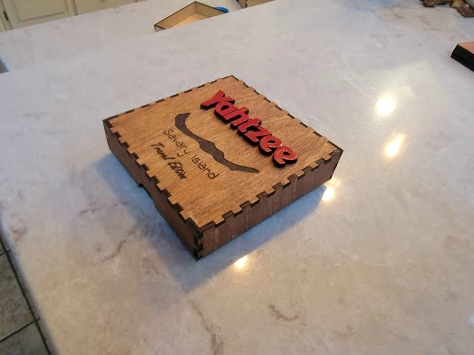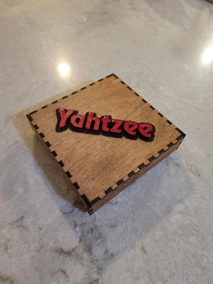 Fancy travel Yahtzee game, fully self-contained in a birch wood case. Laser cut and handmade. Can be made with customized engraving for $10 more. Size is approximately 4.5" x 4.5" x 1". I can easily make more if this one sells. I accept Cash, E-Transfer, Debit, or Credit Card in person.