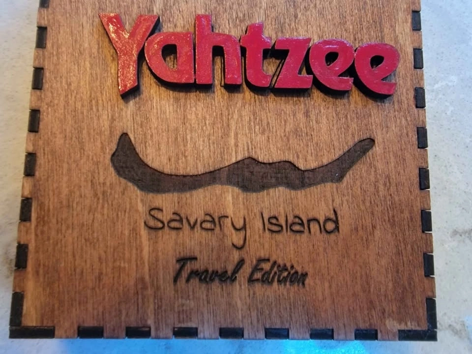 Fancy travel Yahtzee game, fully self-contained in a birch wood case. Laser cut and handmade. Can be made with customized engraving for $10 more. Size is approximately 4.5" x 4.5" x 1". I can easily make more if this one sells. I accept Cash, E-Transfer, Debit, or Credit Card in person.