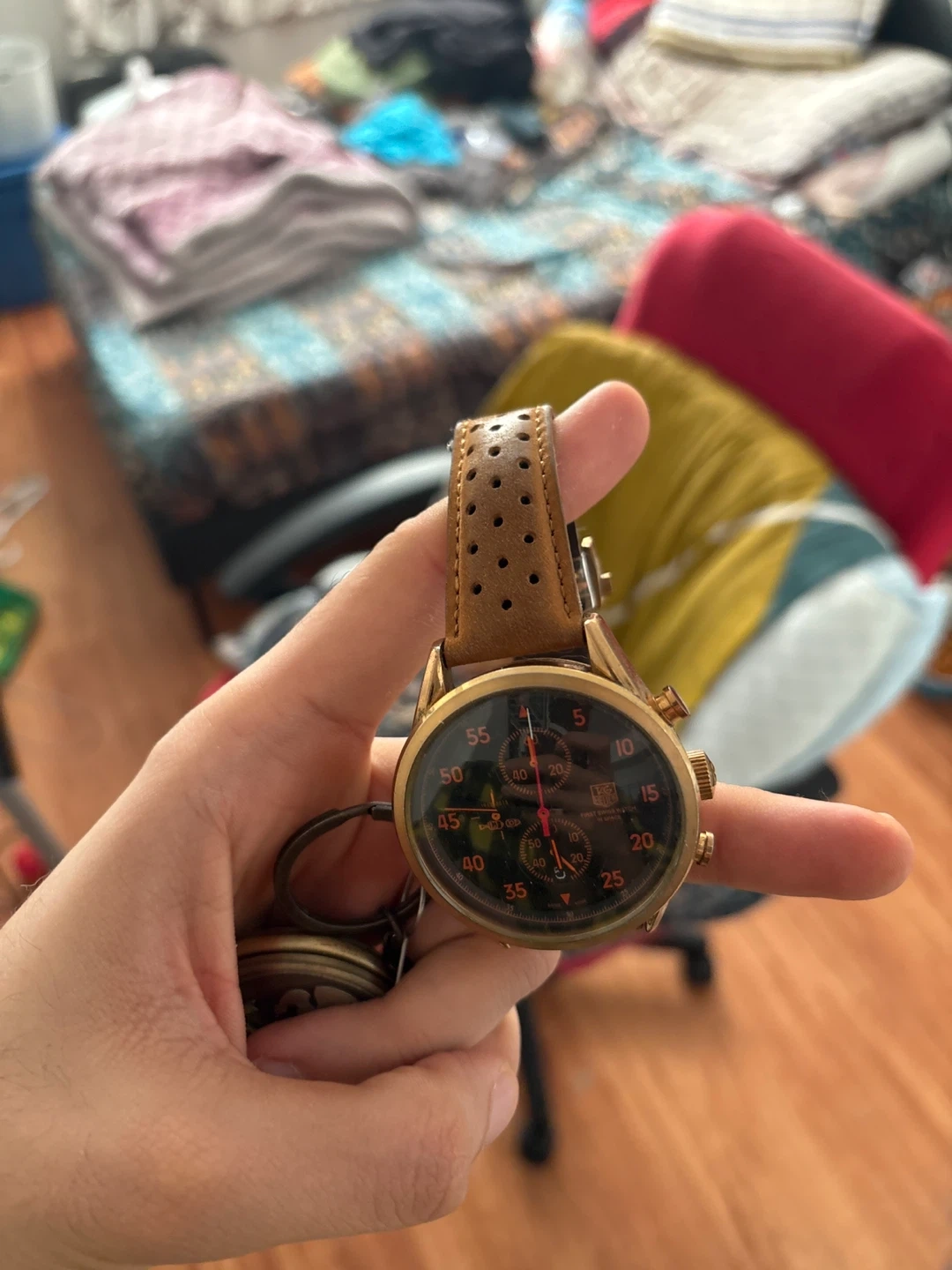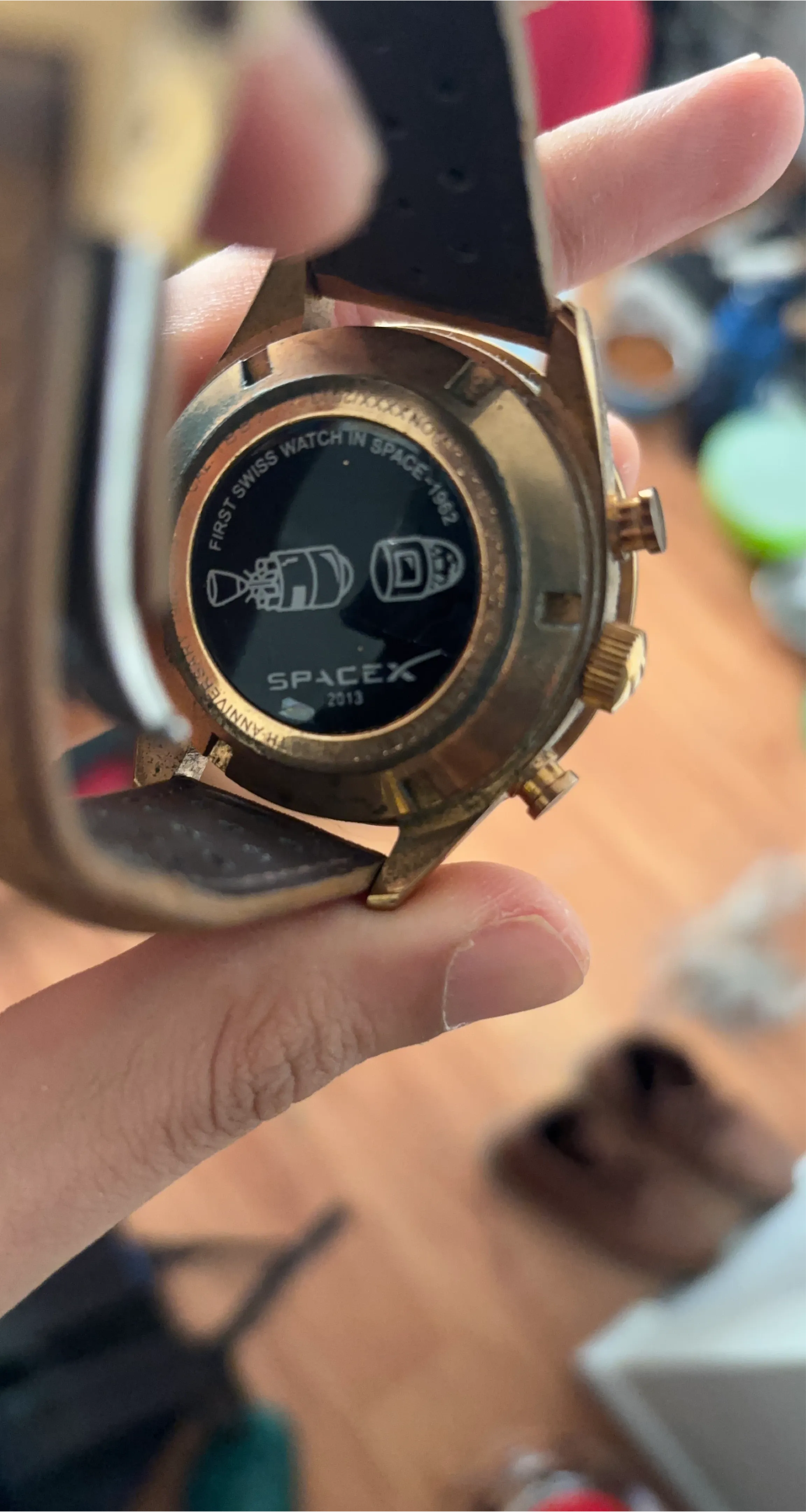 This is a TAG Heuer watch commemorating SpaceX in 2013. It's the first Swiss watch in space. Features a brown leather strap.