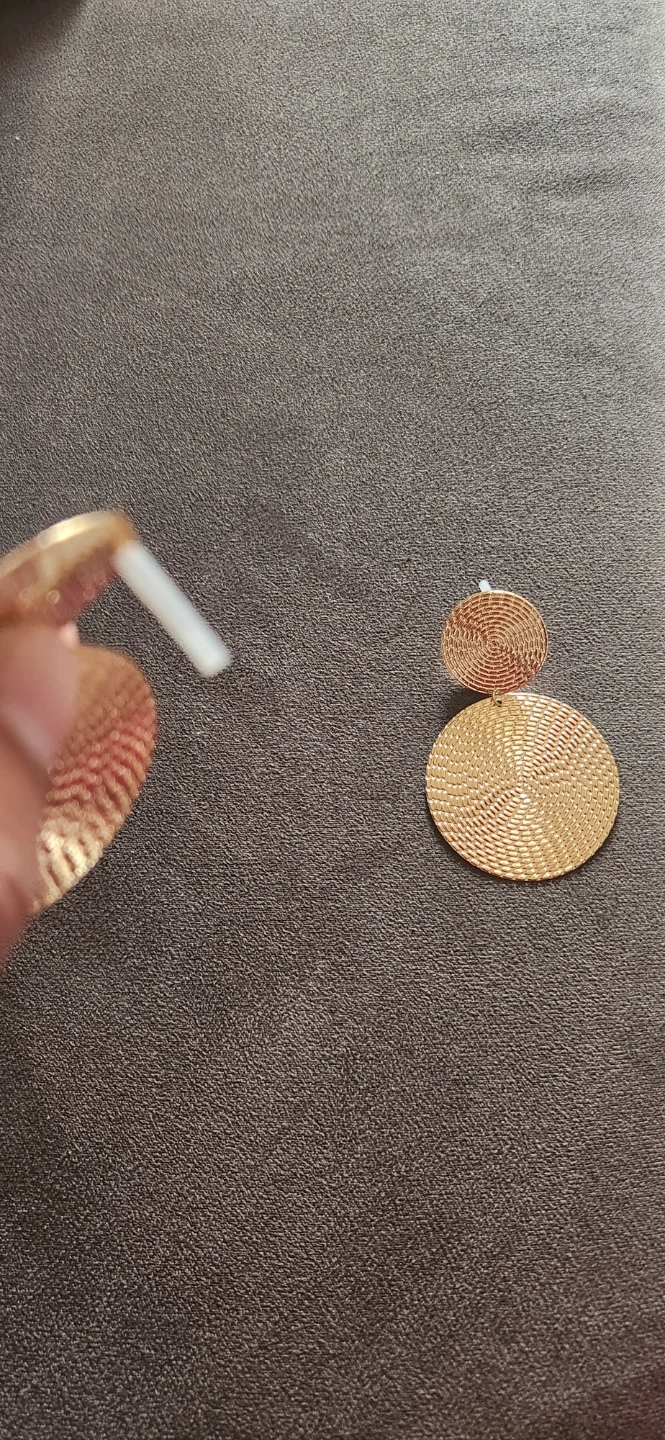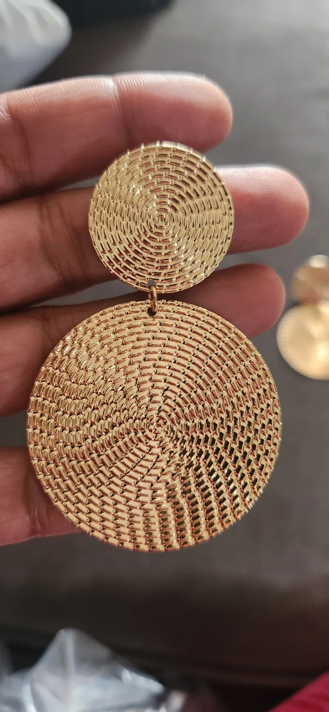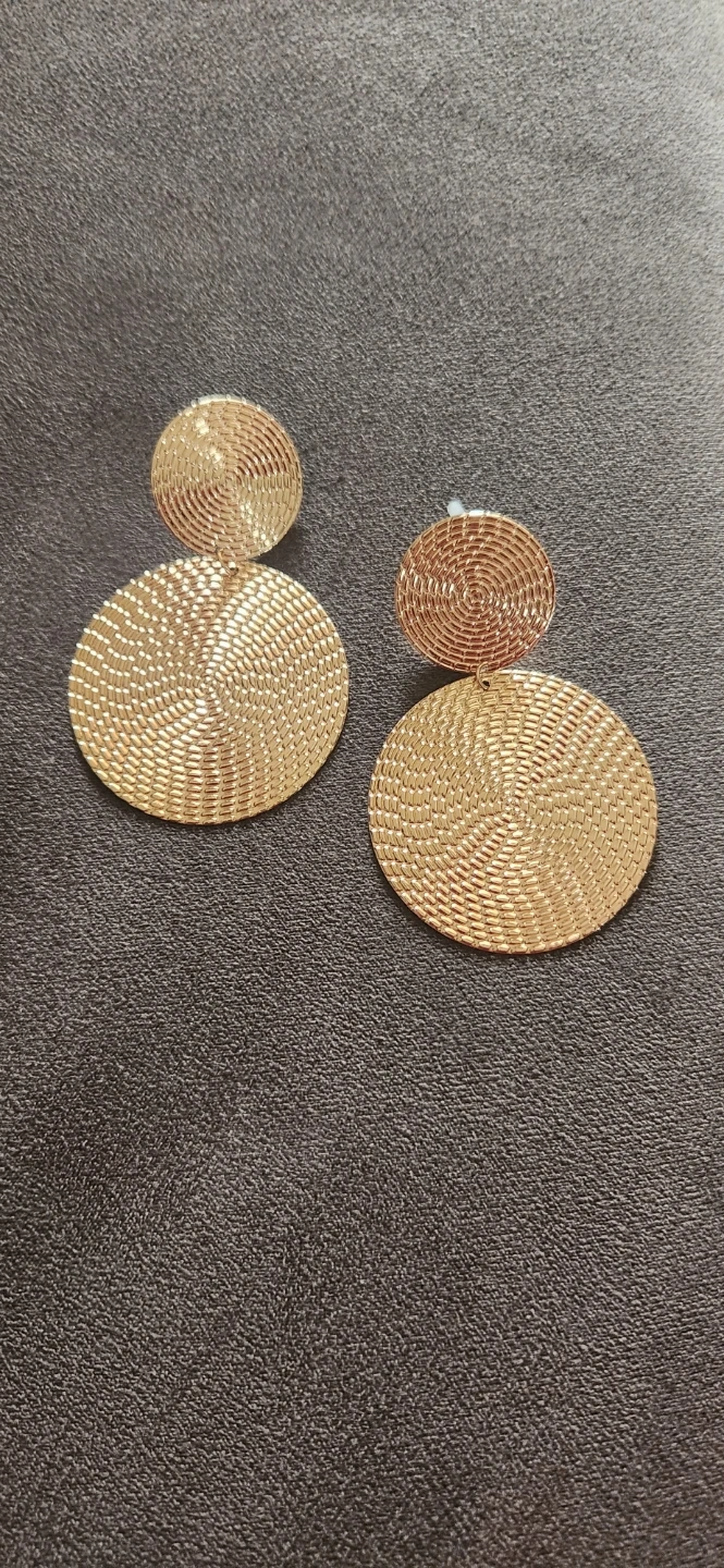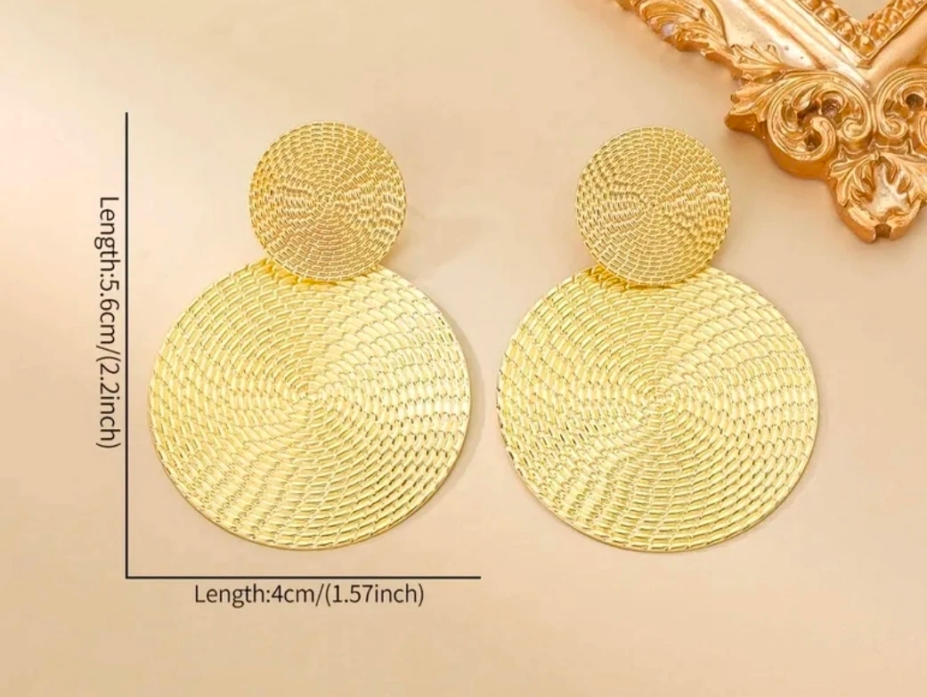 These golden yellow round drop earrings are brand new and ready to add a touch of shine to your outfit! They feature a unique woven texture and a stylish, eye-catching design. The length is 5.6cm (2.2 inches) and the diameter of the large circle is 4cm (1.57 inches)