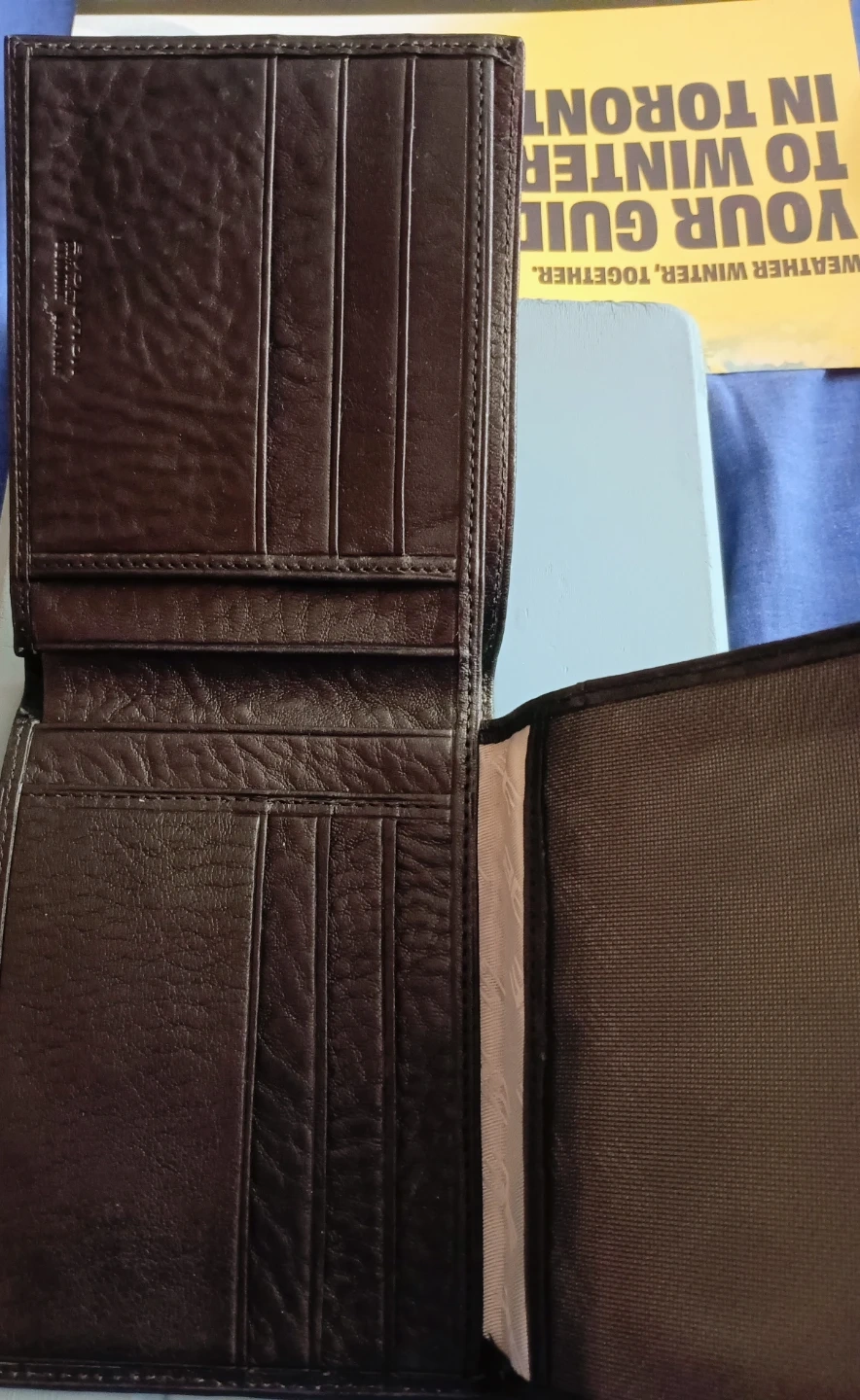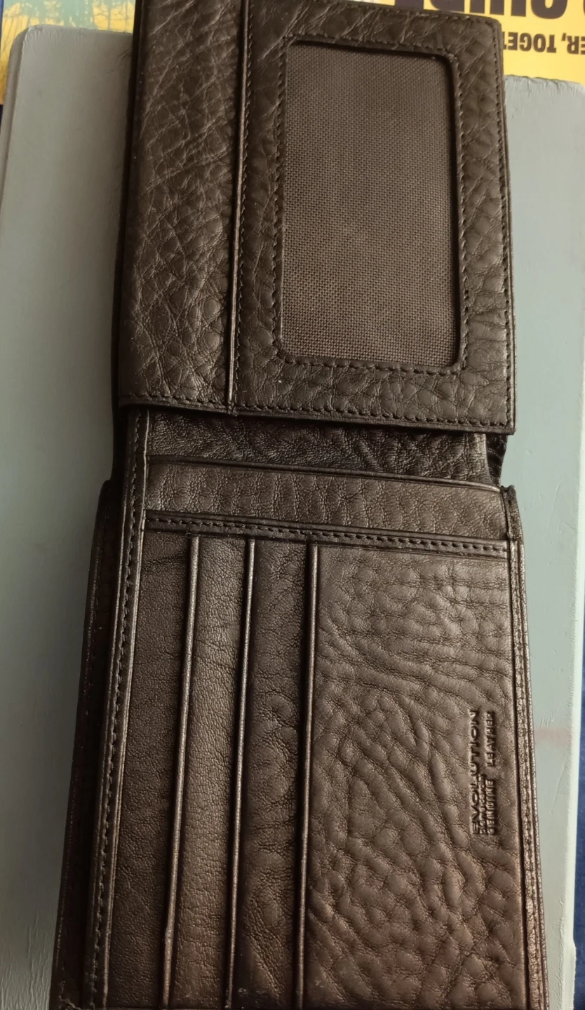 This is a Pierre Cardin bifold wallet. It's made of genuine leather and features multiple card slots and an ID window. Plenty of room for your cash and cards!